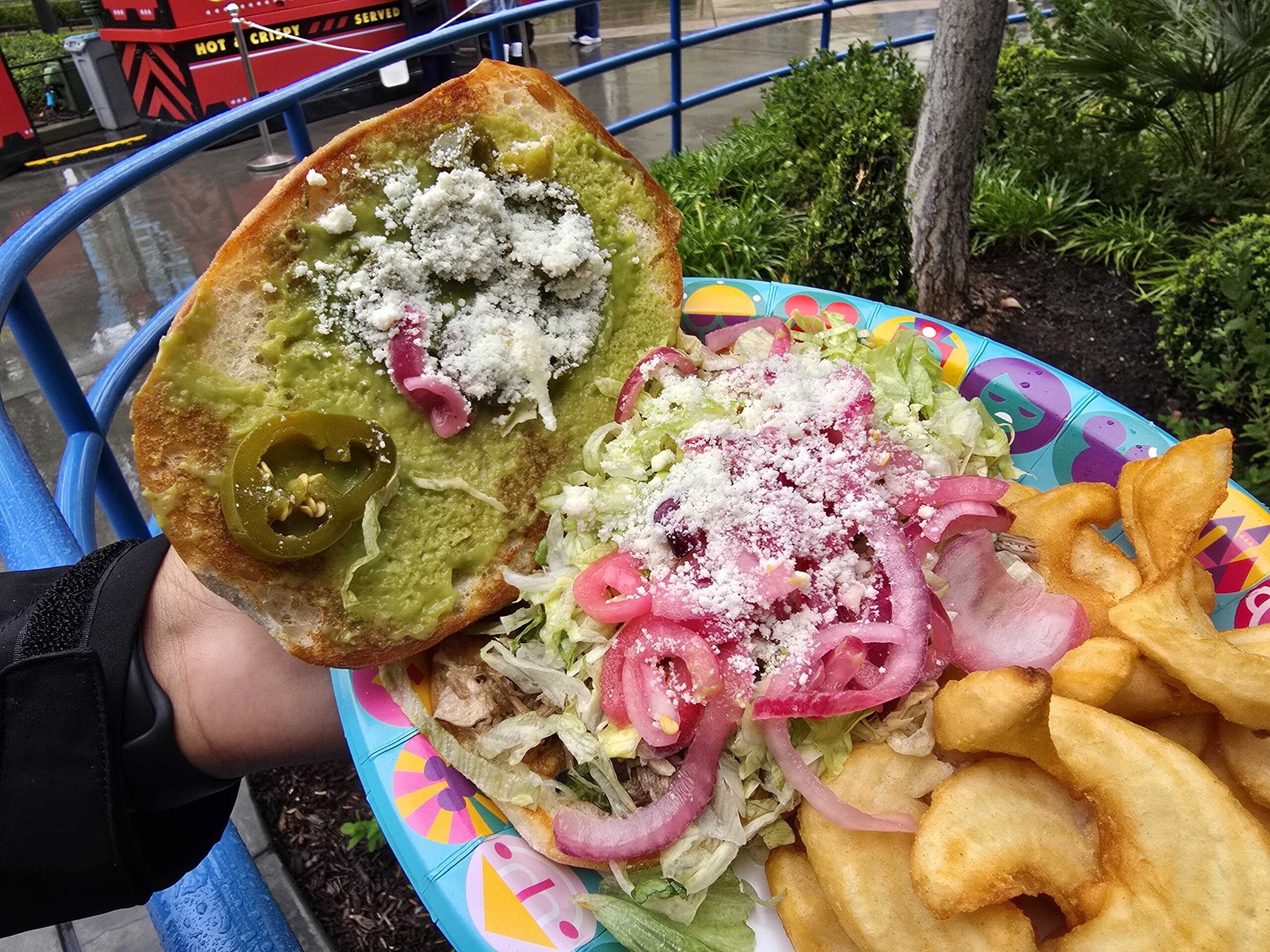 Warm telera bread with carnitas, chorizo beans, cotija, lettuce, pickled onions and jalapeños, and guacamole spread served with fries