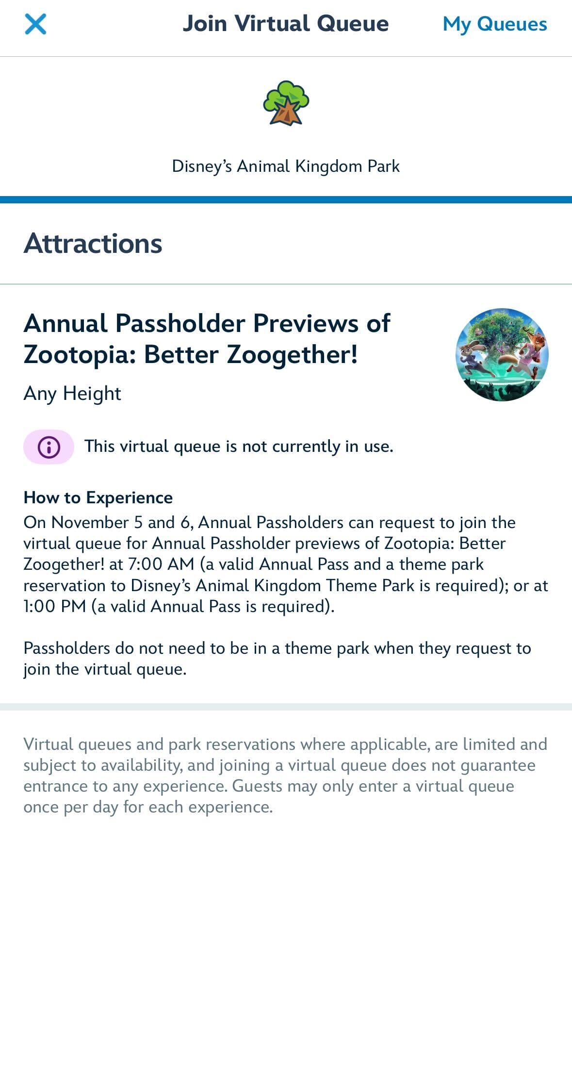 The virtual queue for Zootopia: Better Zoogether has been added to the My Disney Experience app ahead of Annual Passholder Previews.