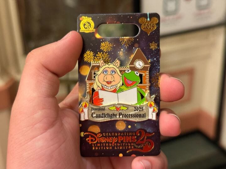 This year’s Candlelight Processional pin features Kermit and Miss Piggy in front of the Main Street train station. Together, they appear to read the story above a banner reading “Disneyland Candlelight Processional 2025.”