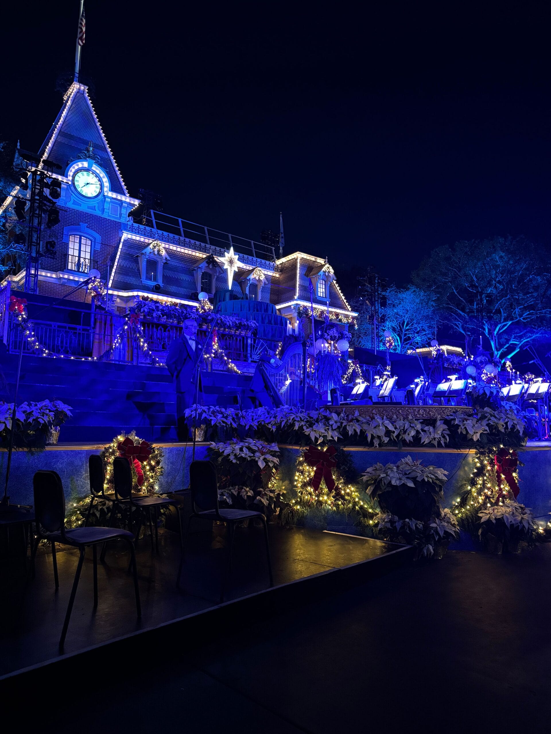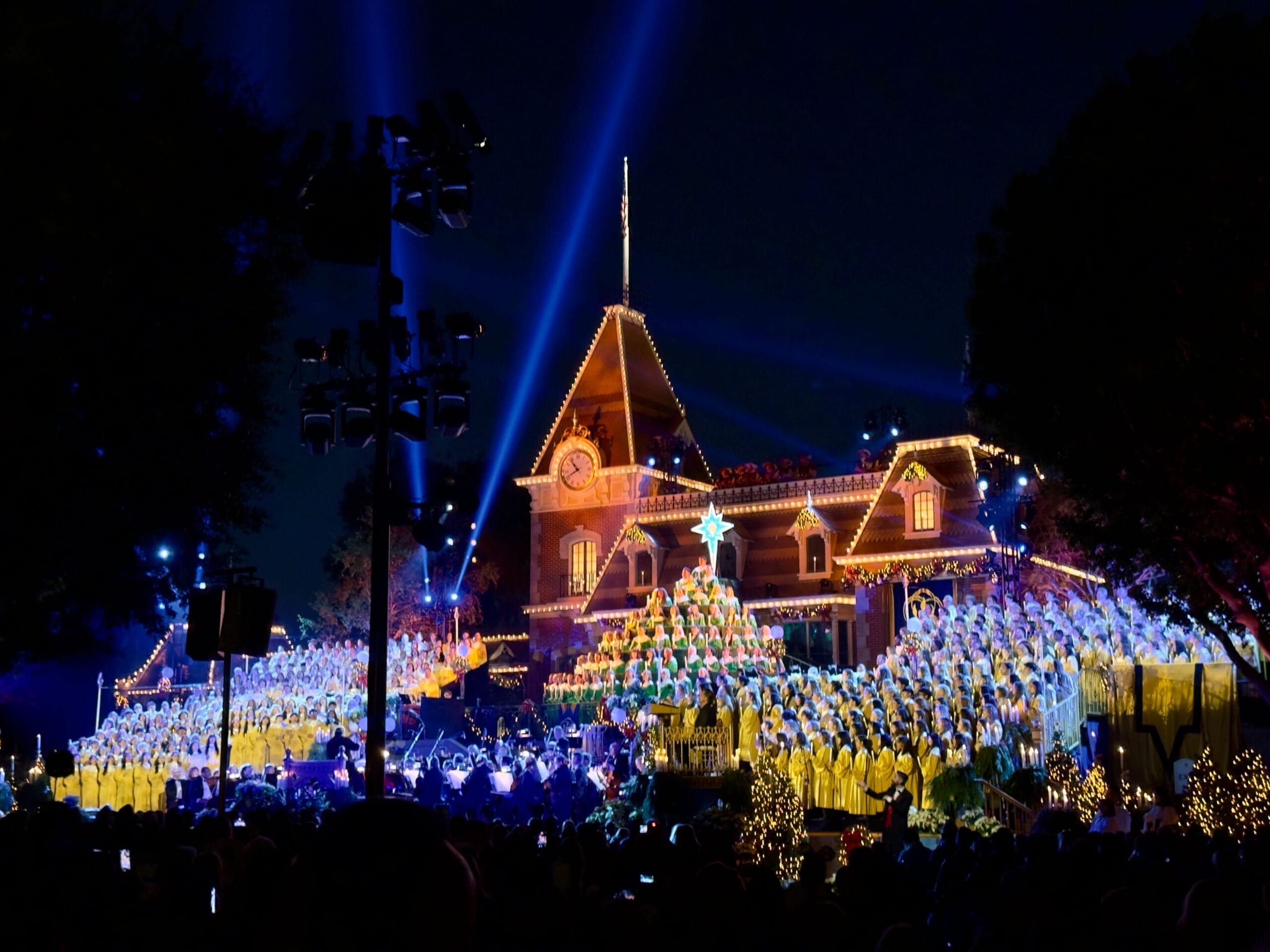 The Candlelight Processional is performed behind the Main Street train station, facing Town Square. A stage is in the square in front of the train station. Up the stairs is a tiered platform for the show’s chorus topped with a silver star. During the show, lights and candles illuminate the stage filled with a vocal choir and an orchestra. The grouping is made up of local high school and community choirs alongside Cast Members. There are also trumpet heralds atop the train station.