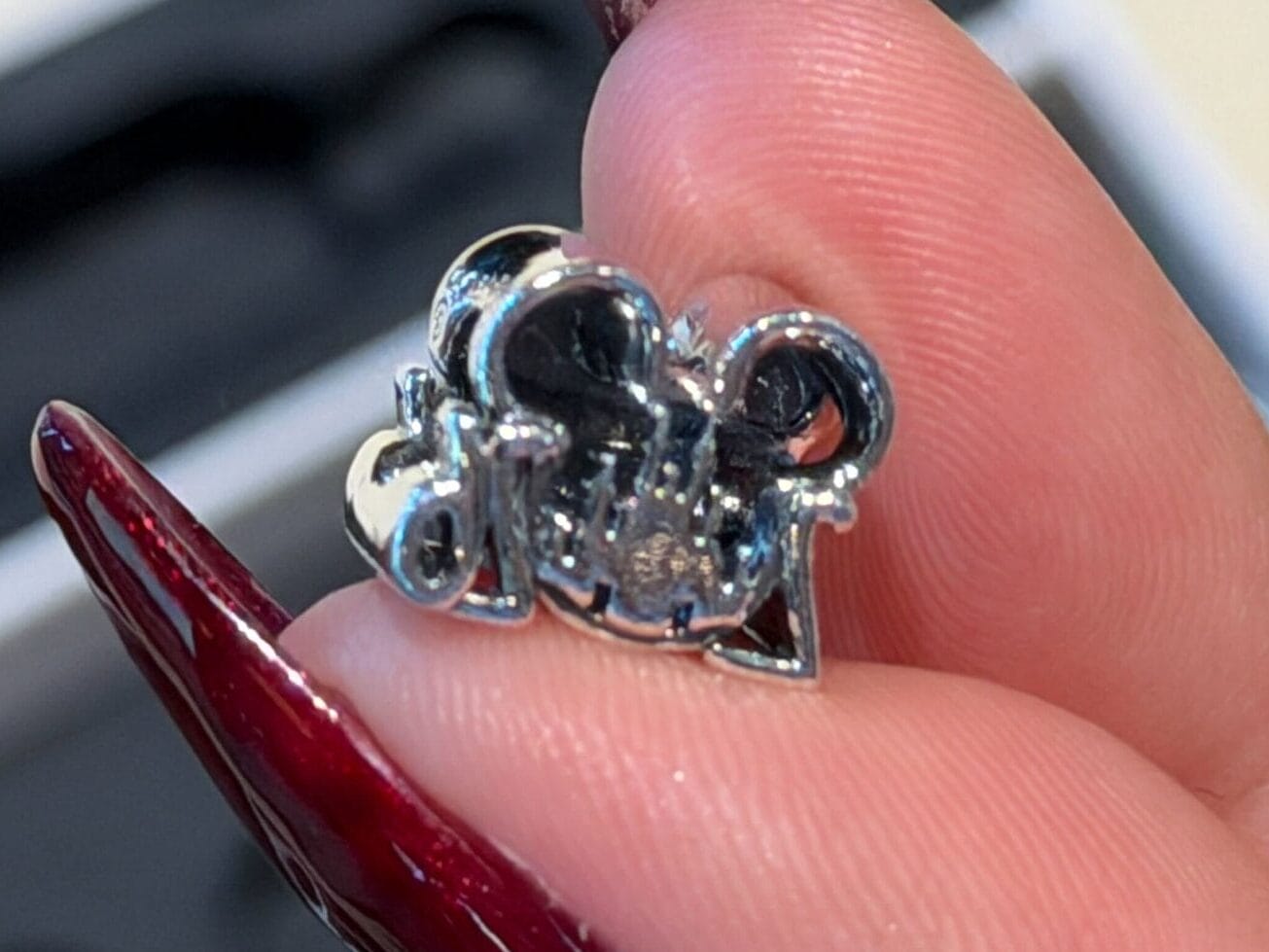 One side of the charm reads “2026” in silver numbers. The “0” is made of a Mickey icon gem. The color is opalescent and reflects shades around it. The rear of the charm reflects the front with a Fantasyland Castle in the center of Mickey.