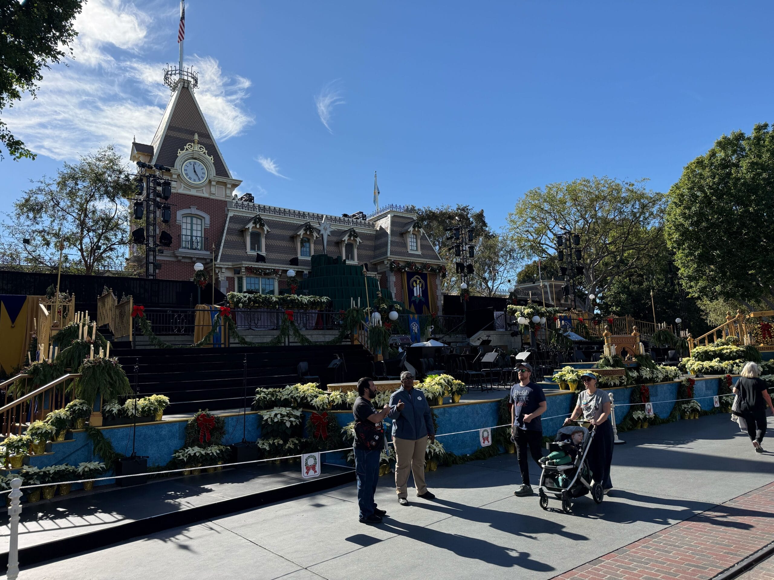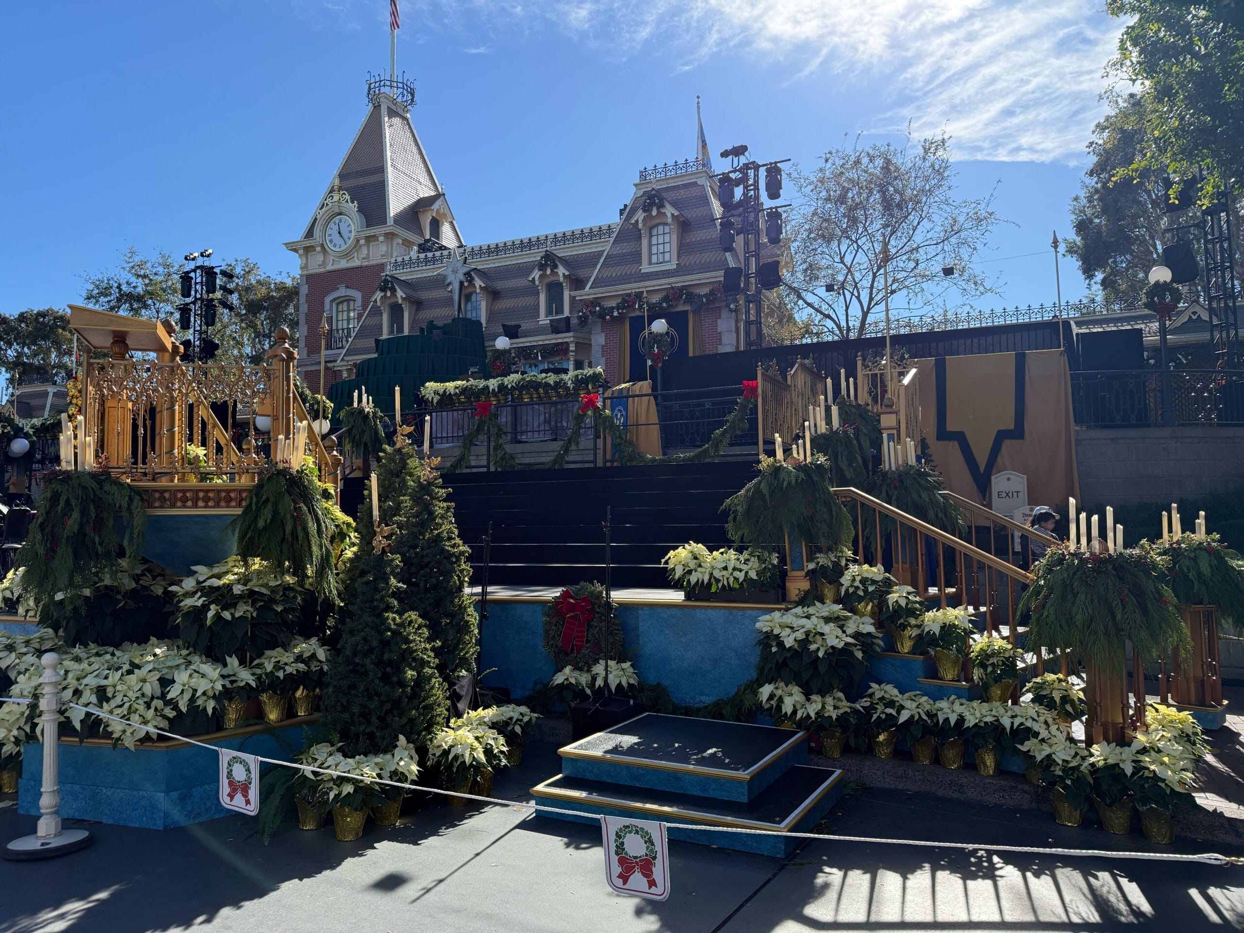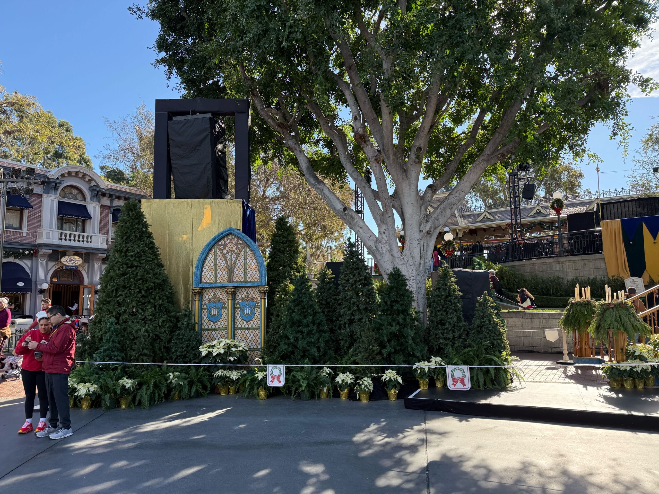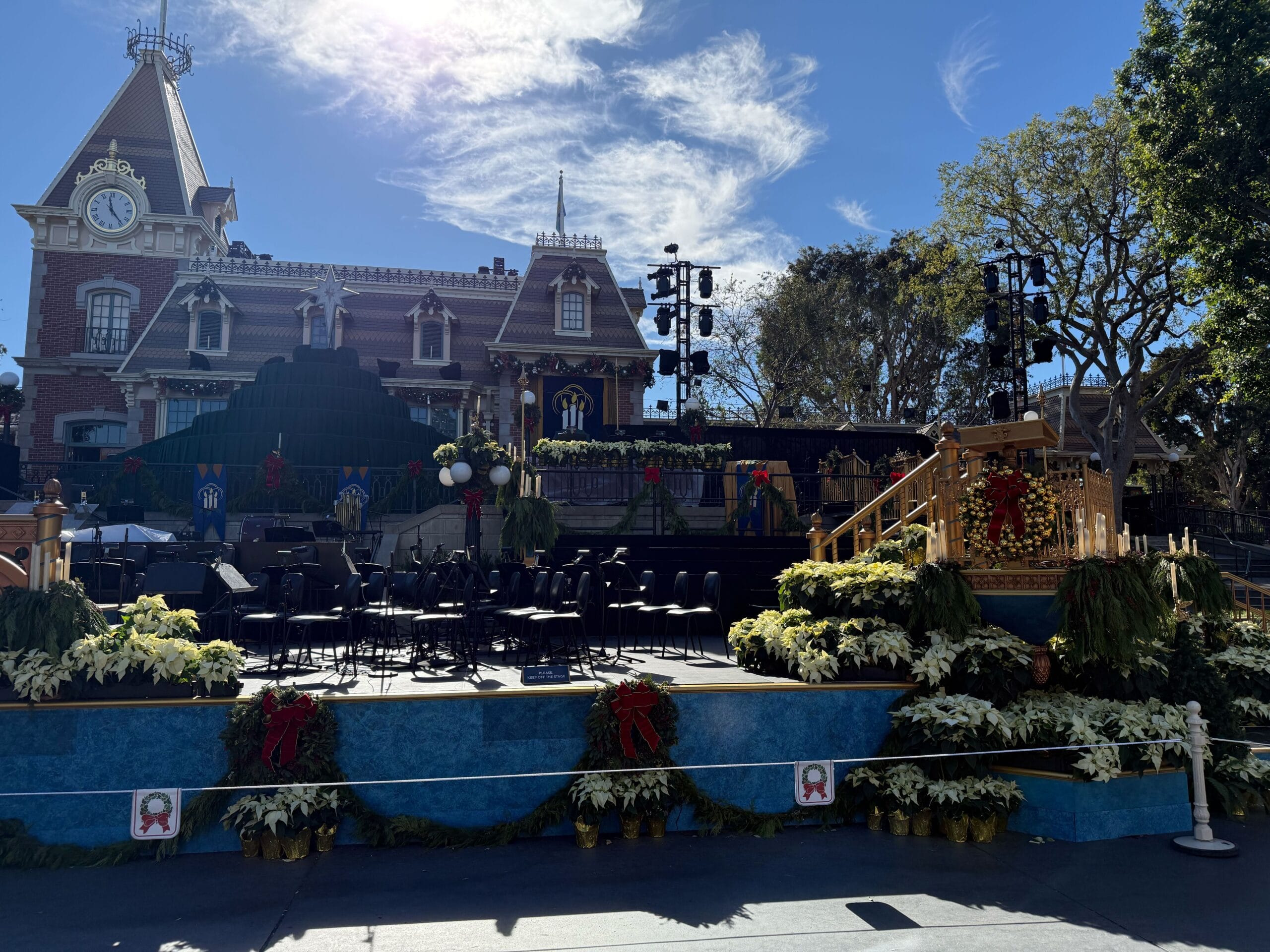 The Candlelight Processional is performed behind the Main Street train station, facing Town Square. A stage is in the square in front of the train station. Up the stairs is a tiered platform for the show’s chorus topped with a silver star.