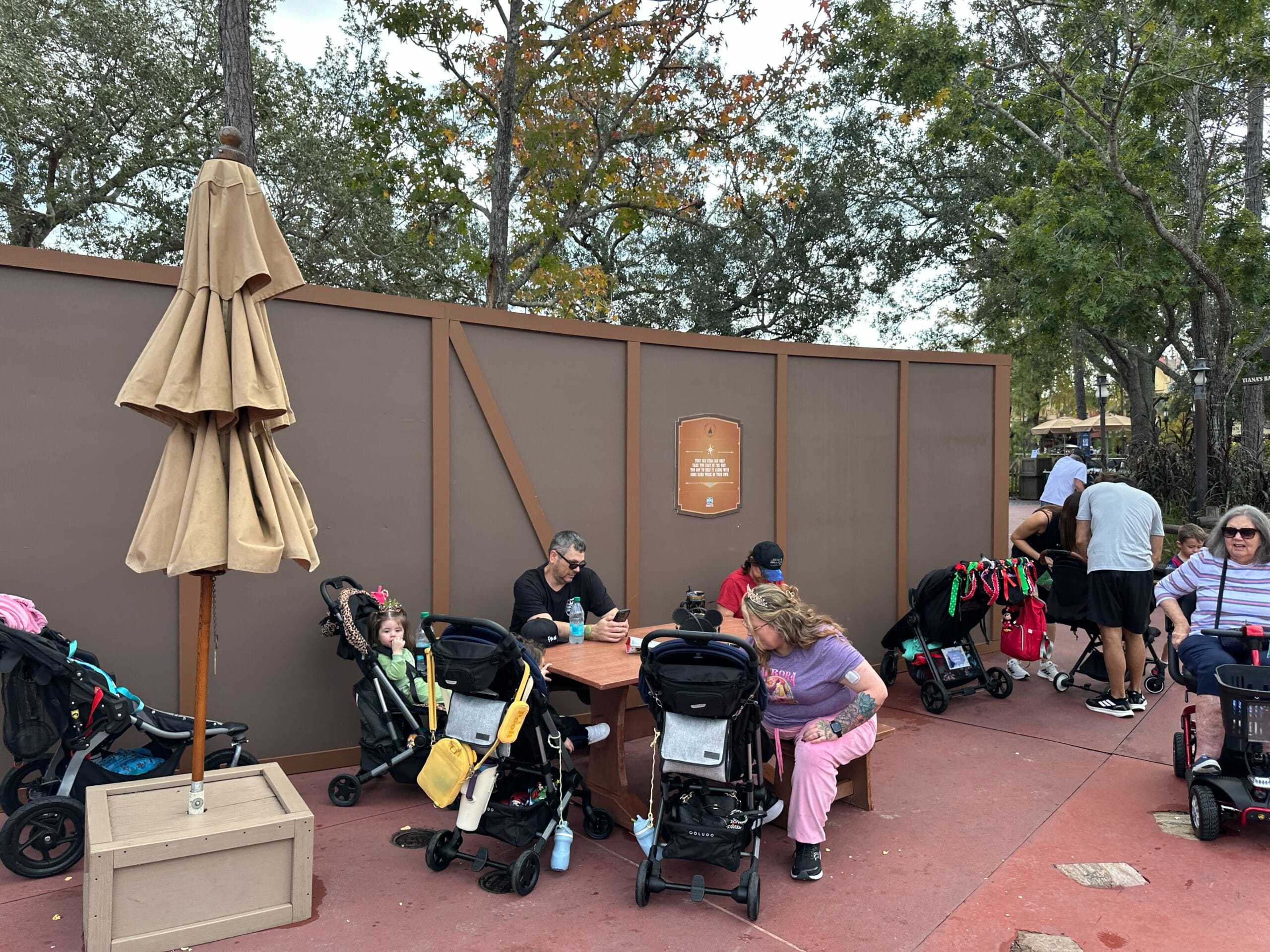 There are some picnic tables and umbrellas next to the Big Thudnder construction walls, providing guests a space to relax.