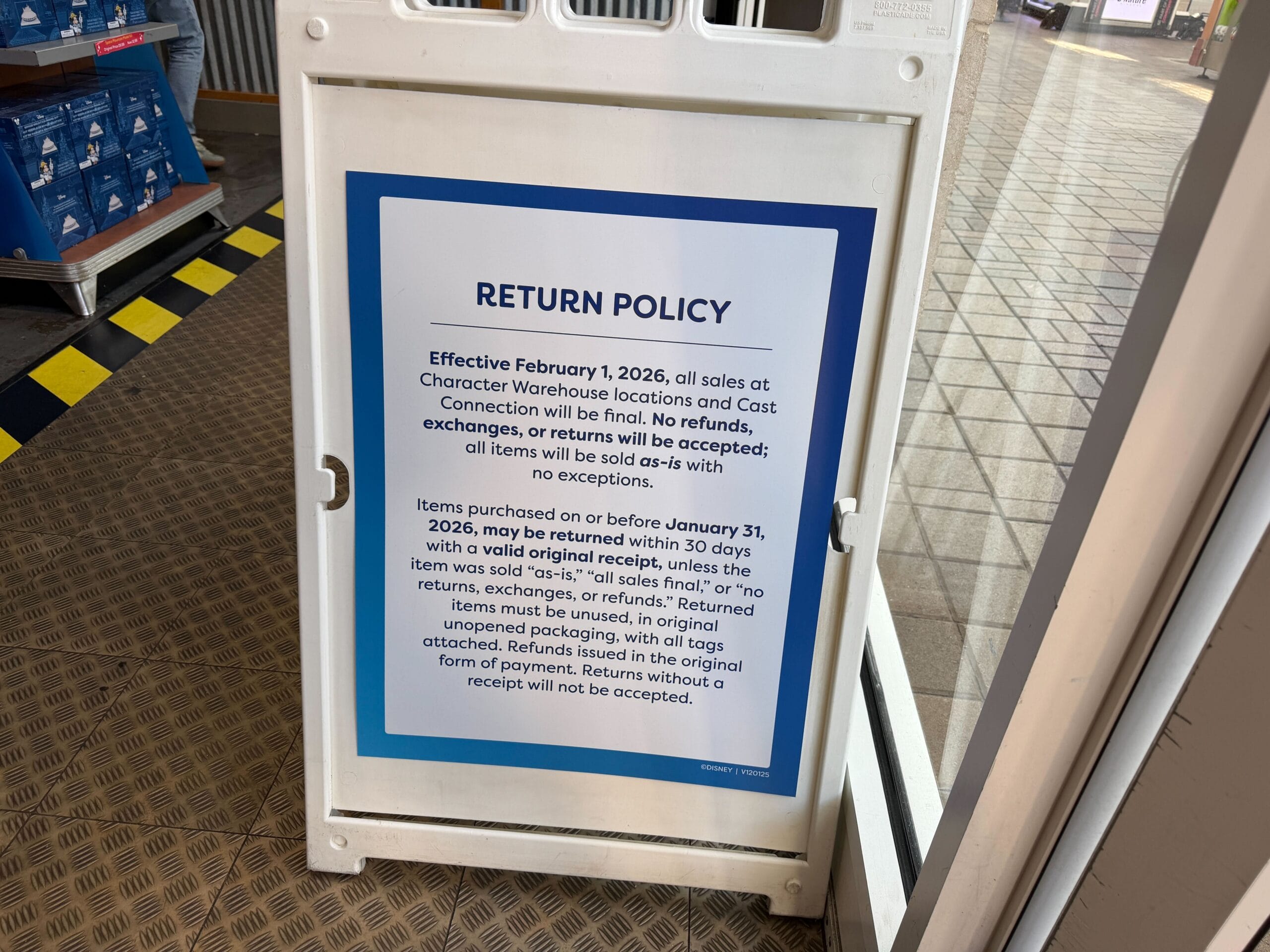 As of February 1, 2026, all sales at Disney Character Warehouse and Cast Connection will be final, meaning nothing can be returned. This new return policy is being implemented to deter resellers, who would exploit the previous policy by purchasing merchandise, relisting it for sale, and then returning unsold stock to the outlet.