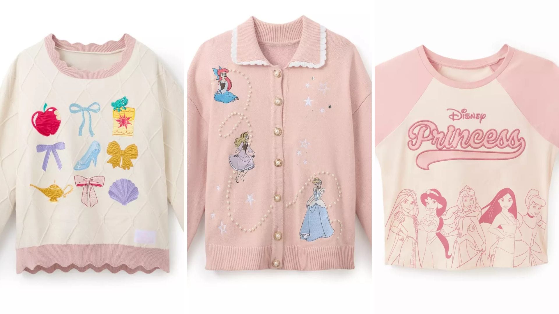 This is a light pink button-up cardigan with white scalloped trim around the collar. The buttons are large faux pearls in gold frames. Embroidered appliqués of Ariel, Aurora, and Cinderella are on the chest, with a string of pearls between them.