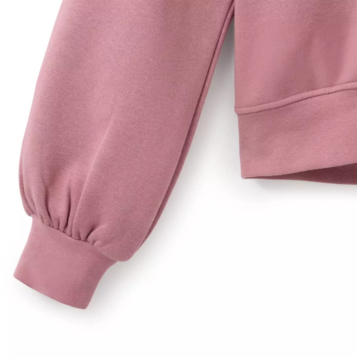 The sweatshirt is a dark blush pink color with screen art of Disney Princesses and an embroidered ribbon design embroidered around the V-shaped neck. It has dropped shoulders and blouson long sleeves. It’s 60% cotton and 40% polyester.