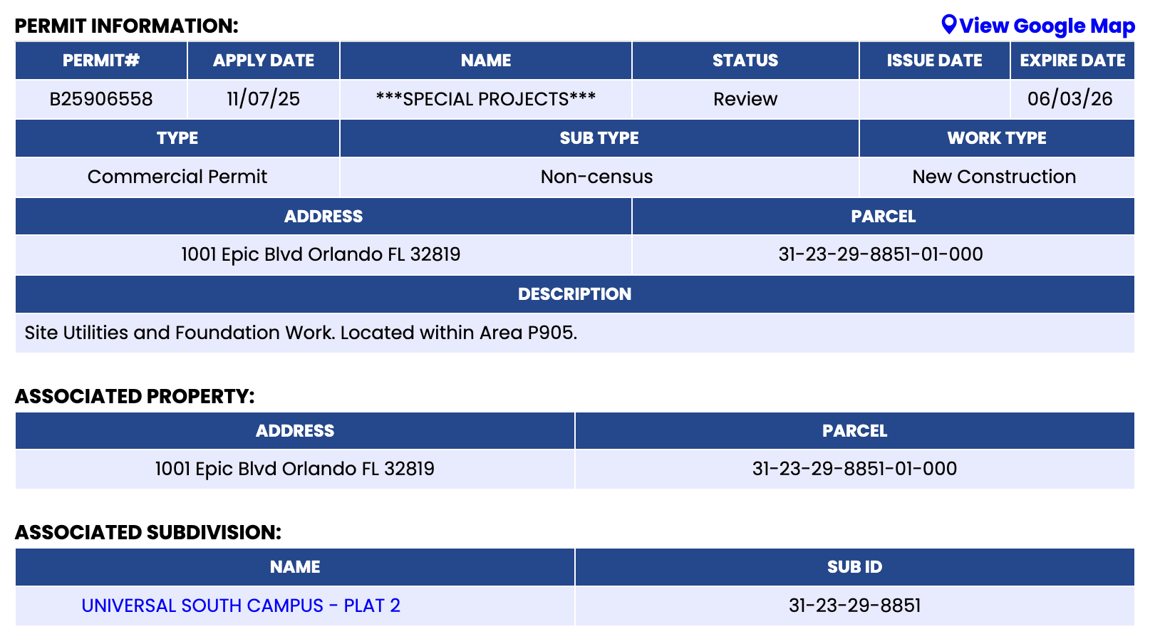 As we previously reported, the Orange County permit is for “New Construction,” specifically “Site Utilities and Foundation Work” at 1001 Epic Blvd, Orlando, FL 32819. The permit has since received the extra note “Located within Area P905.” P905 is the code name for The Wizarding World of Harry Potter – Ministry of Magic.
