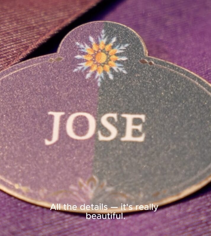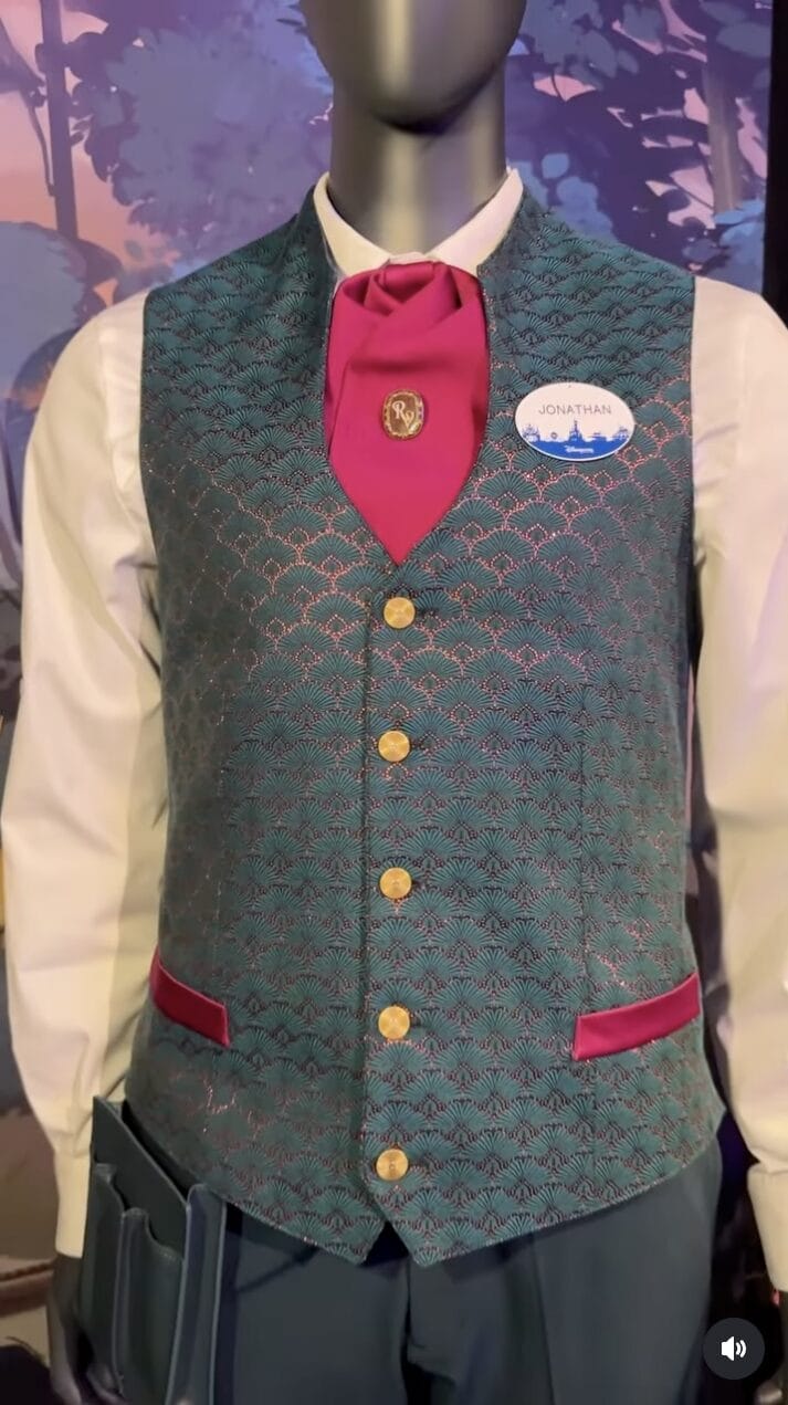 The Cast Member costumes have golden buttons and tie pins. The restaurant is not inside World of Frozen but is located nearby.