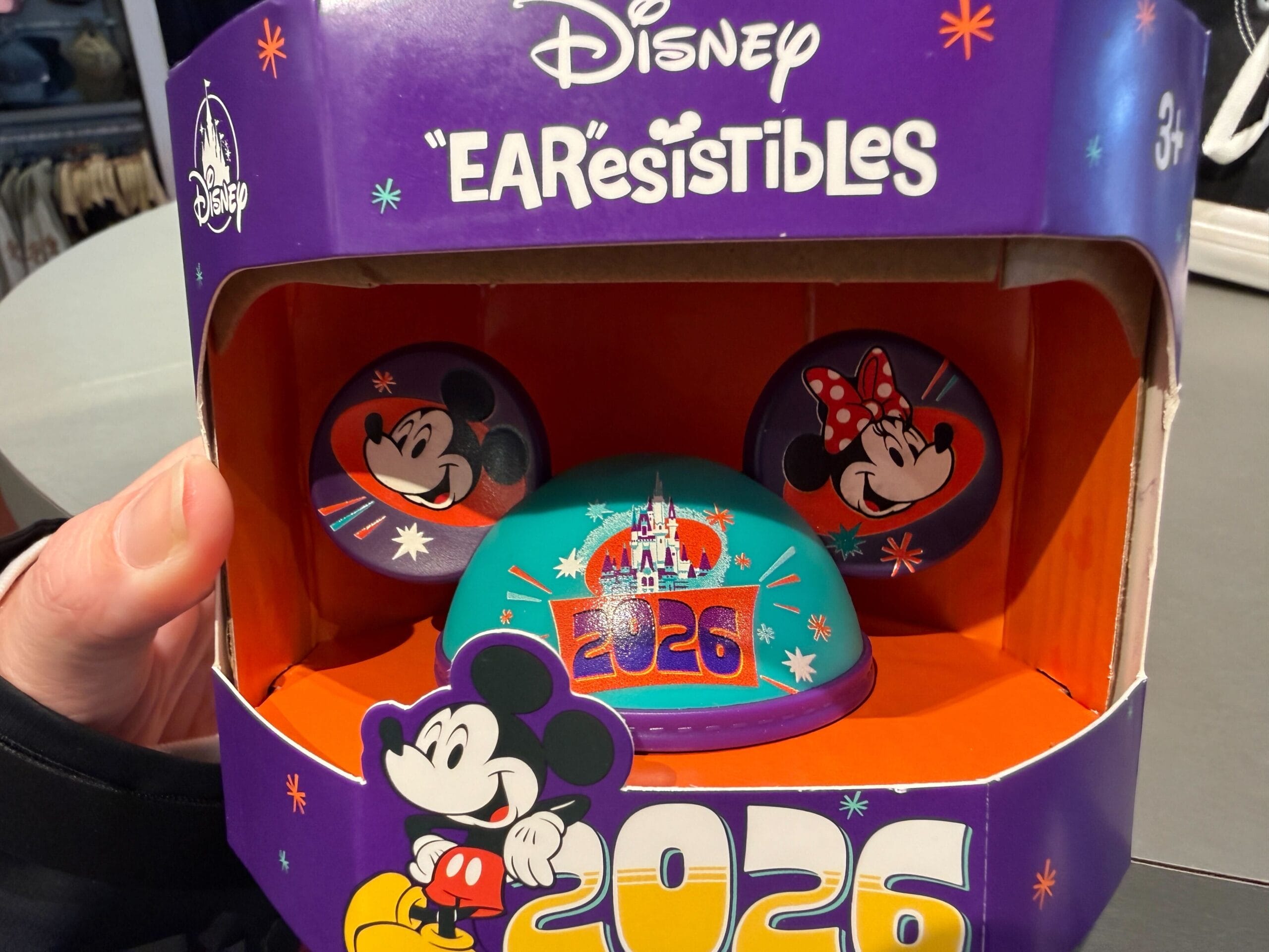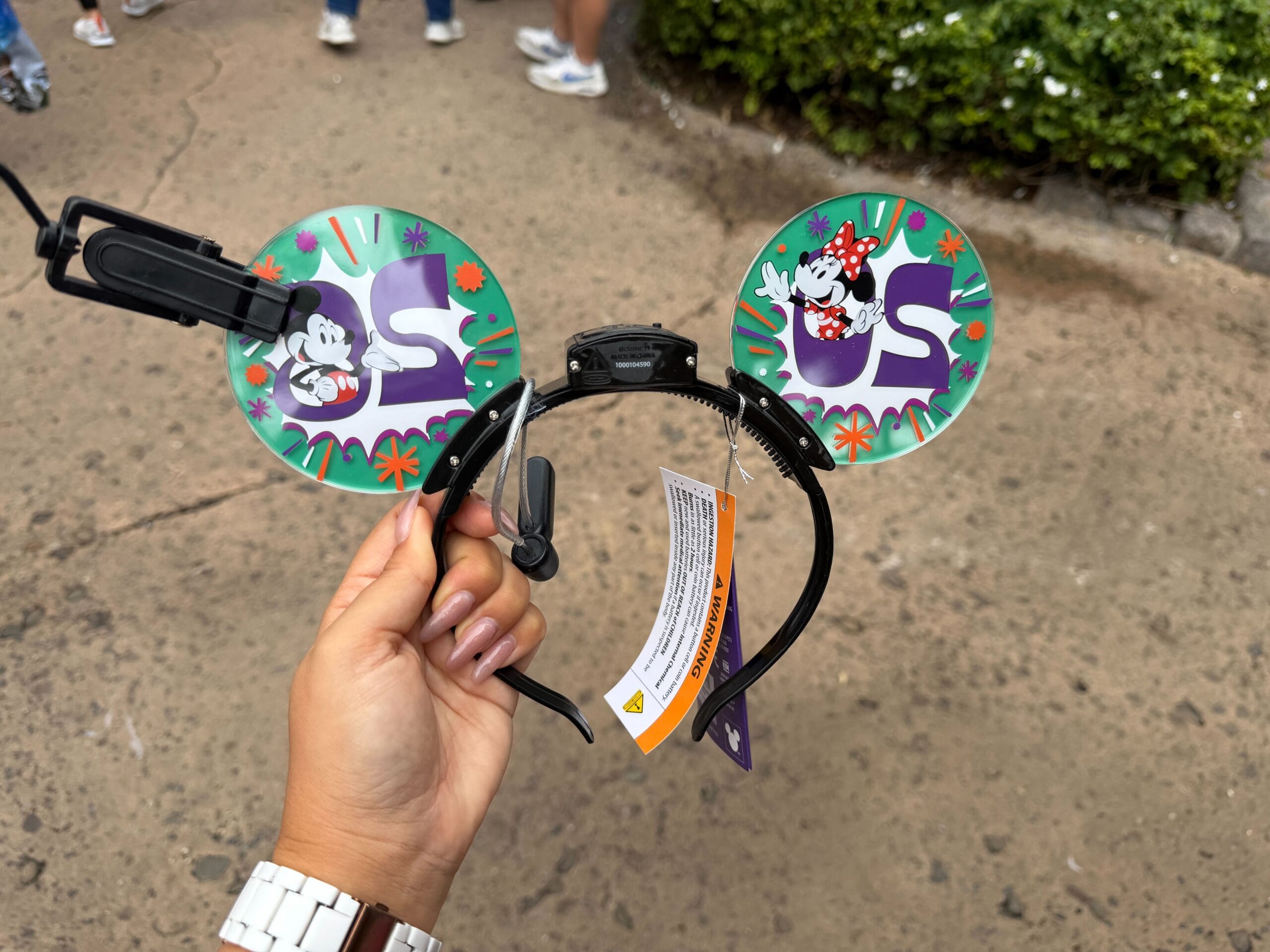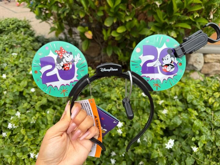 The ear headband is made of hard plastic and the headband has small teeth to help it stay securely in hair. “20” is on one ear with Minnie and “26” is on the other ear with Mickey. The numbers are purple, set against a white starburst and teal-colored background with orange stars.
