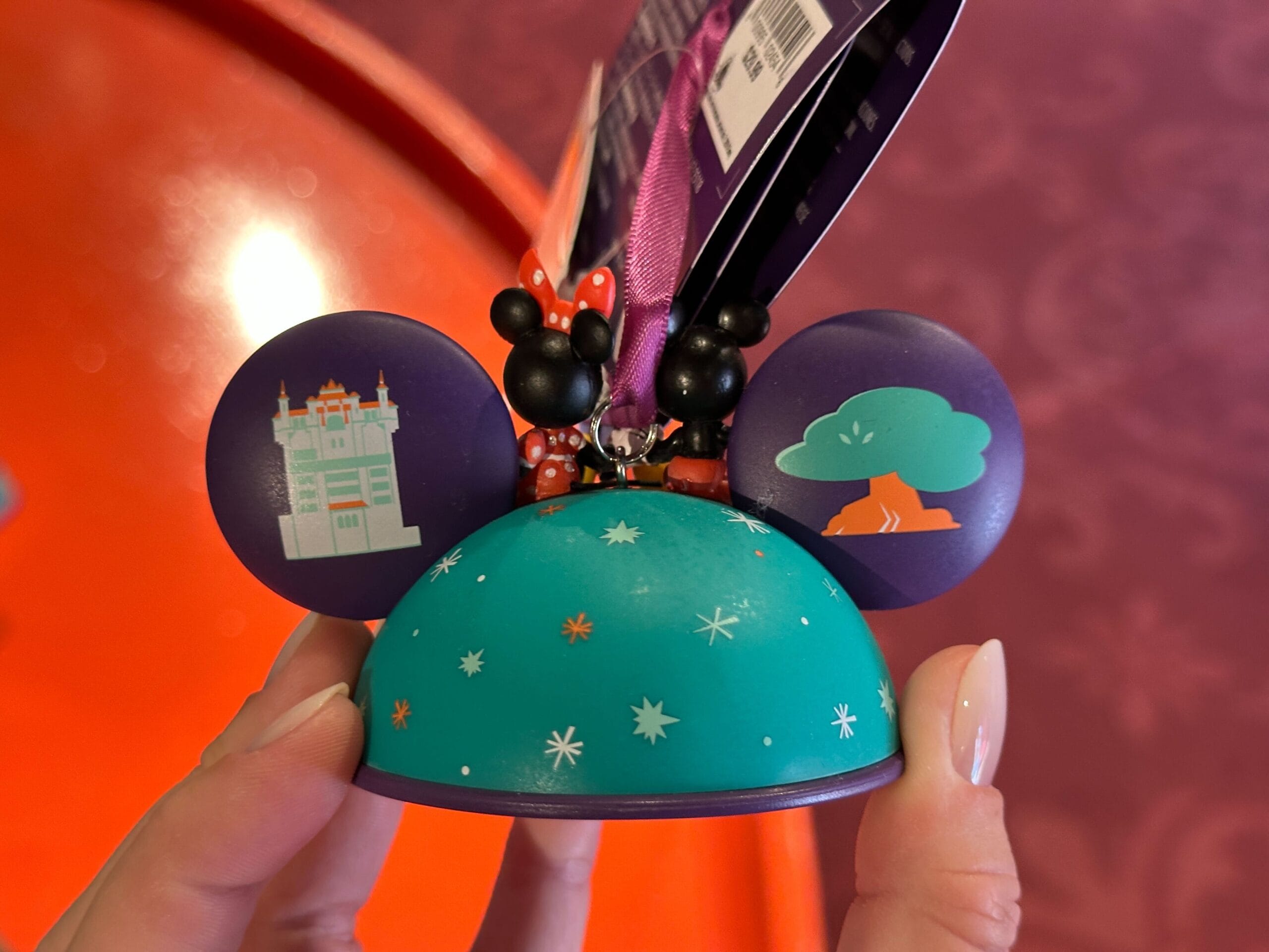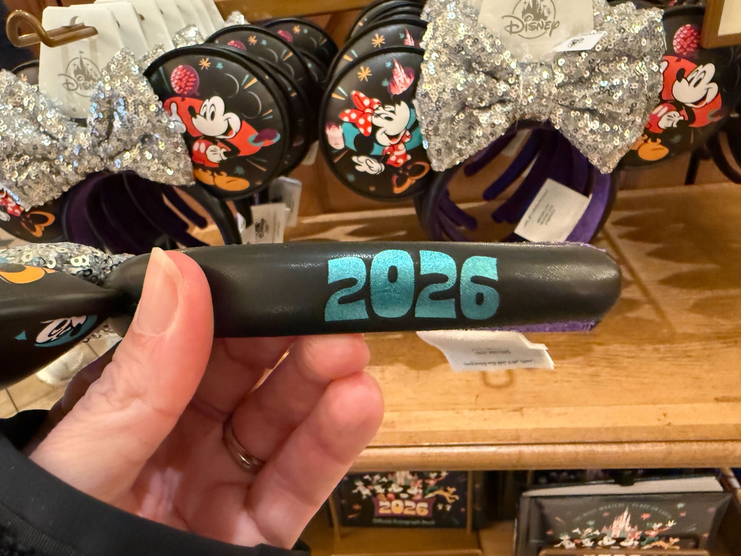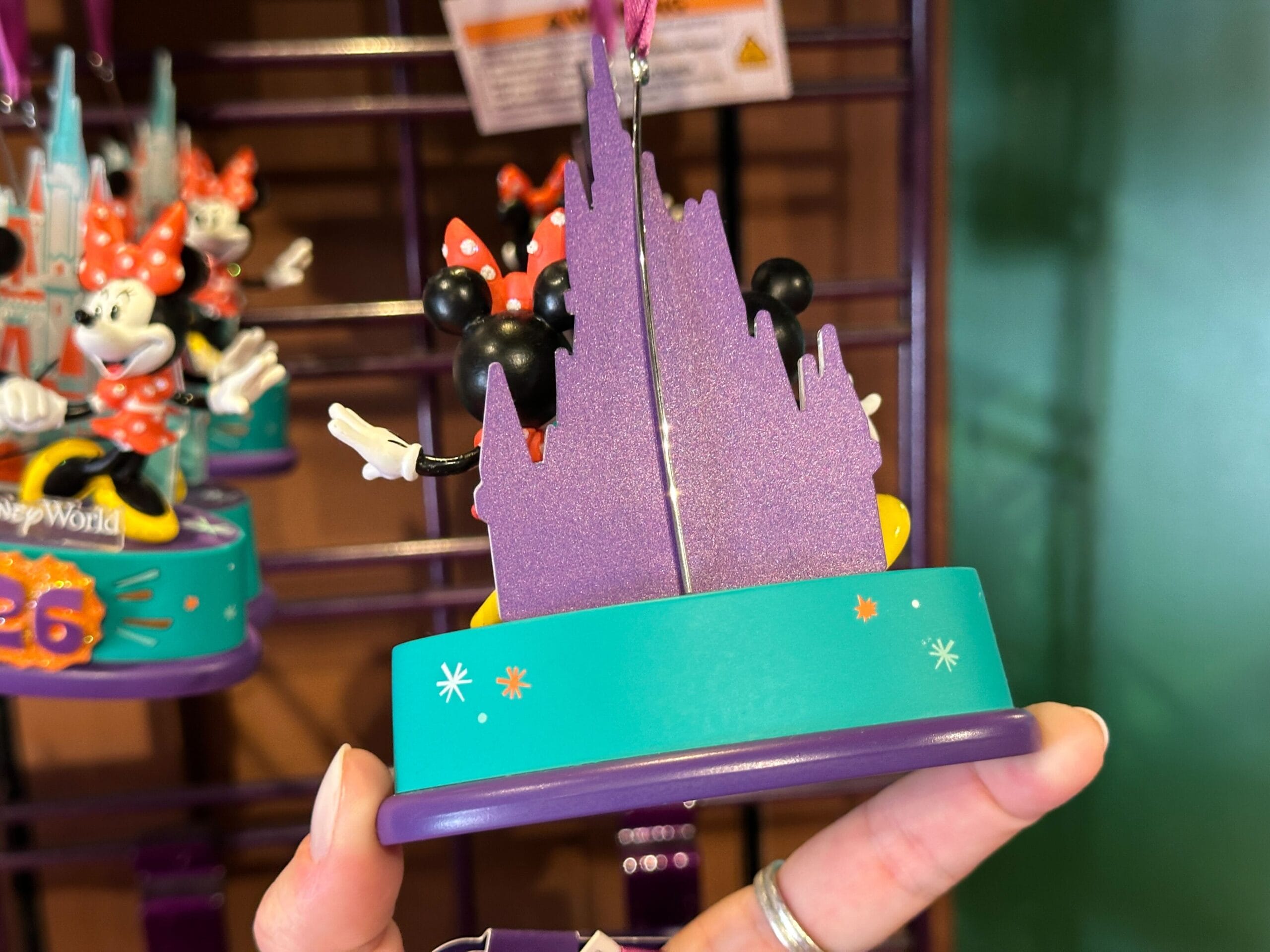 The ear headband is made of hard plastic and the headband has small teeth to help it stay securely in hair. “20” is on one ear with Minnie and “26” is on the other ear with Mickey. The numbers are purple, set against a white starburst and teal-colored background with orange stars.