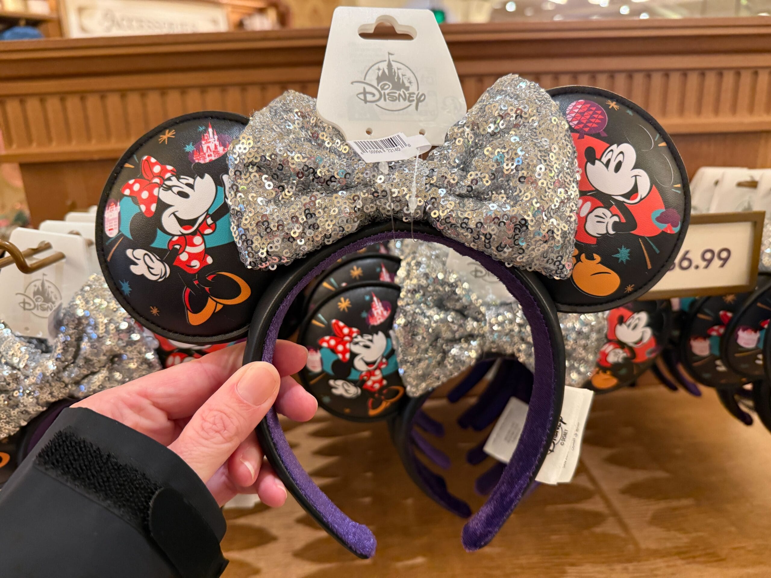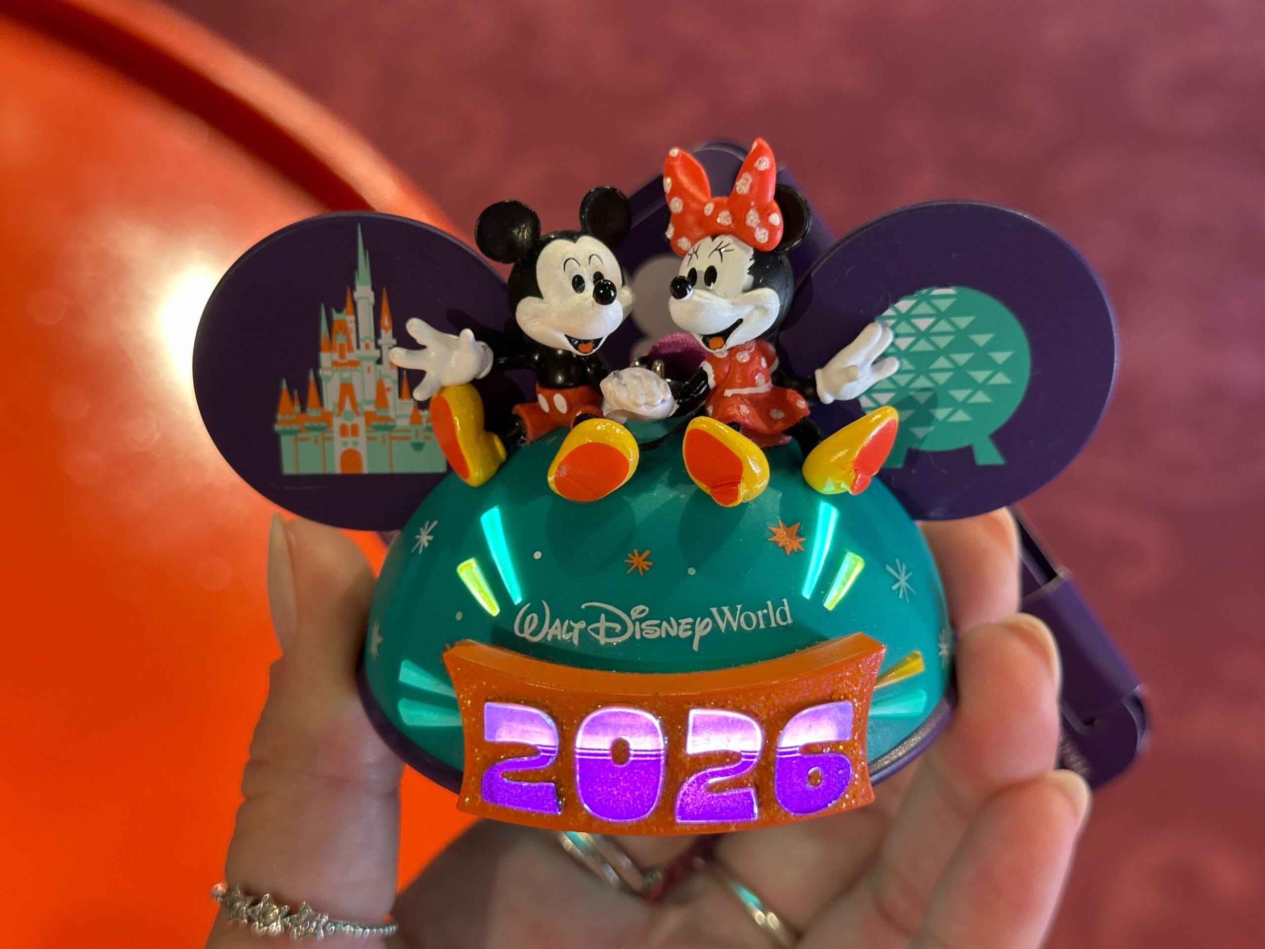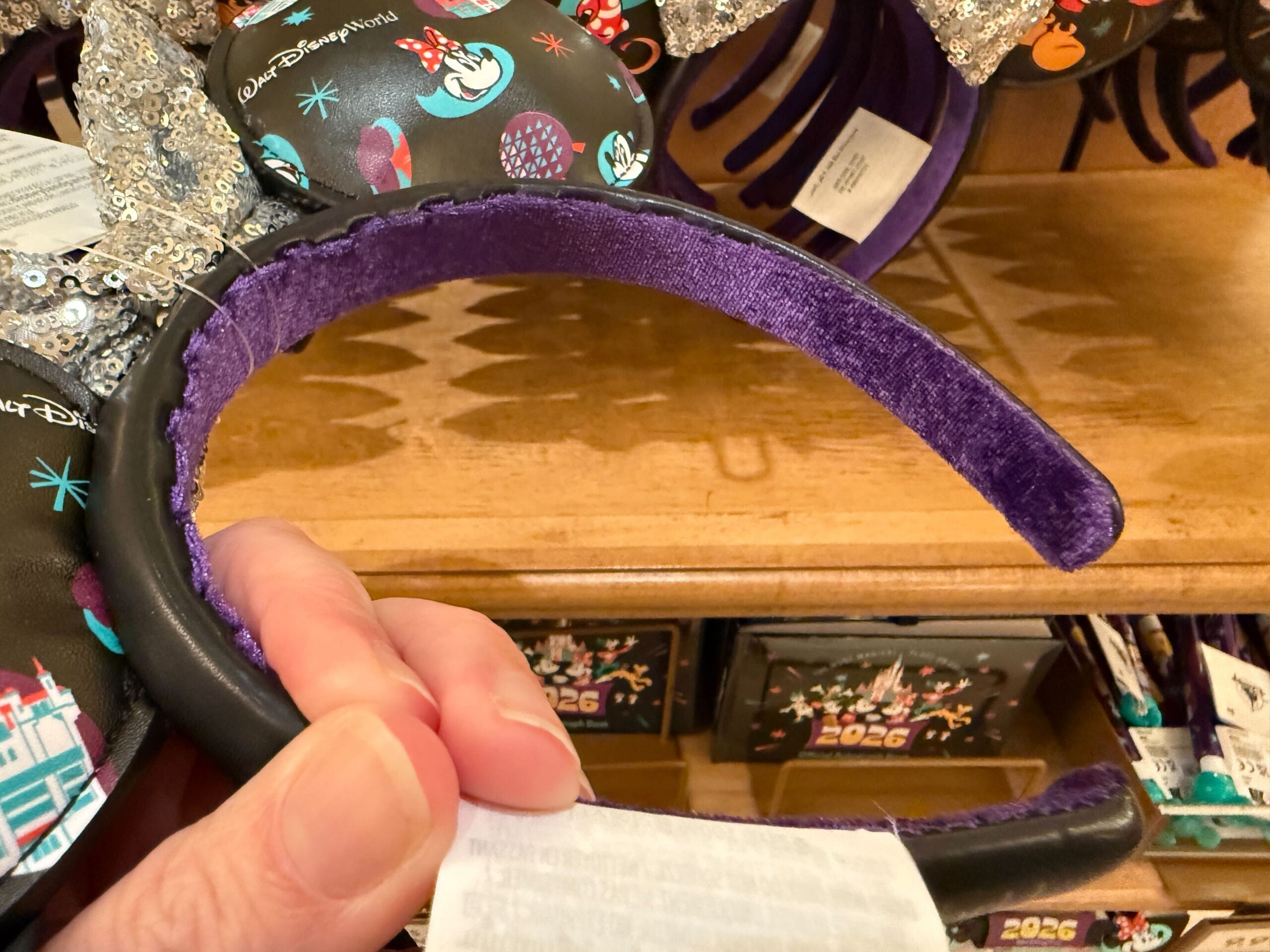 The backs of the ears feature smaller images of Mickey, Minnie, and the icons. “Walt Disney World” is on one side of the headband and “2026” is on the other side. The lining is purple velour.