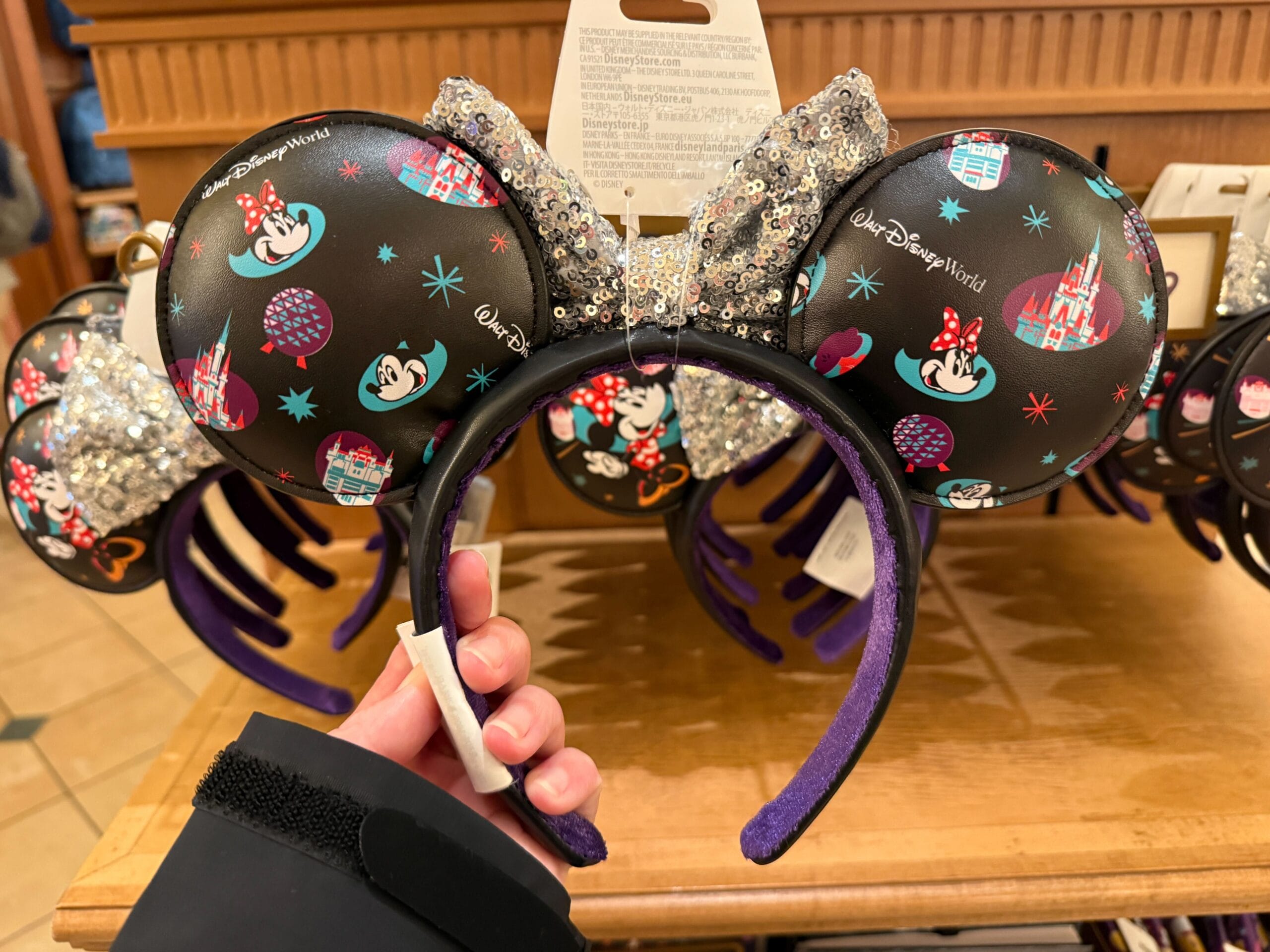 The standard ear headband is covered in black faux leather. It has a bow covered in silver sequins. Mickey and Minnie are on the fronts of the ears with stars and park icons.
