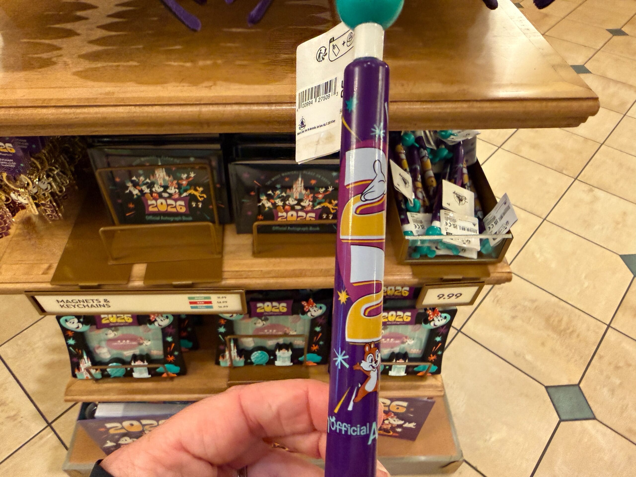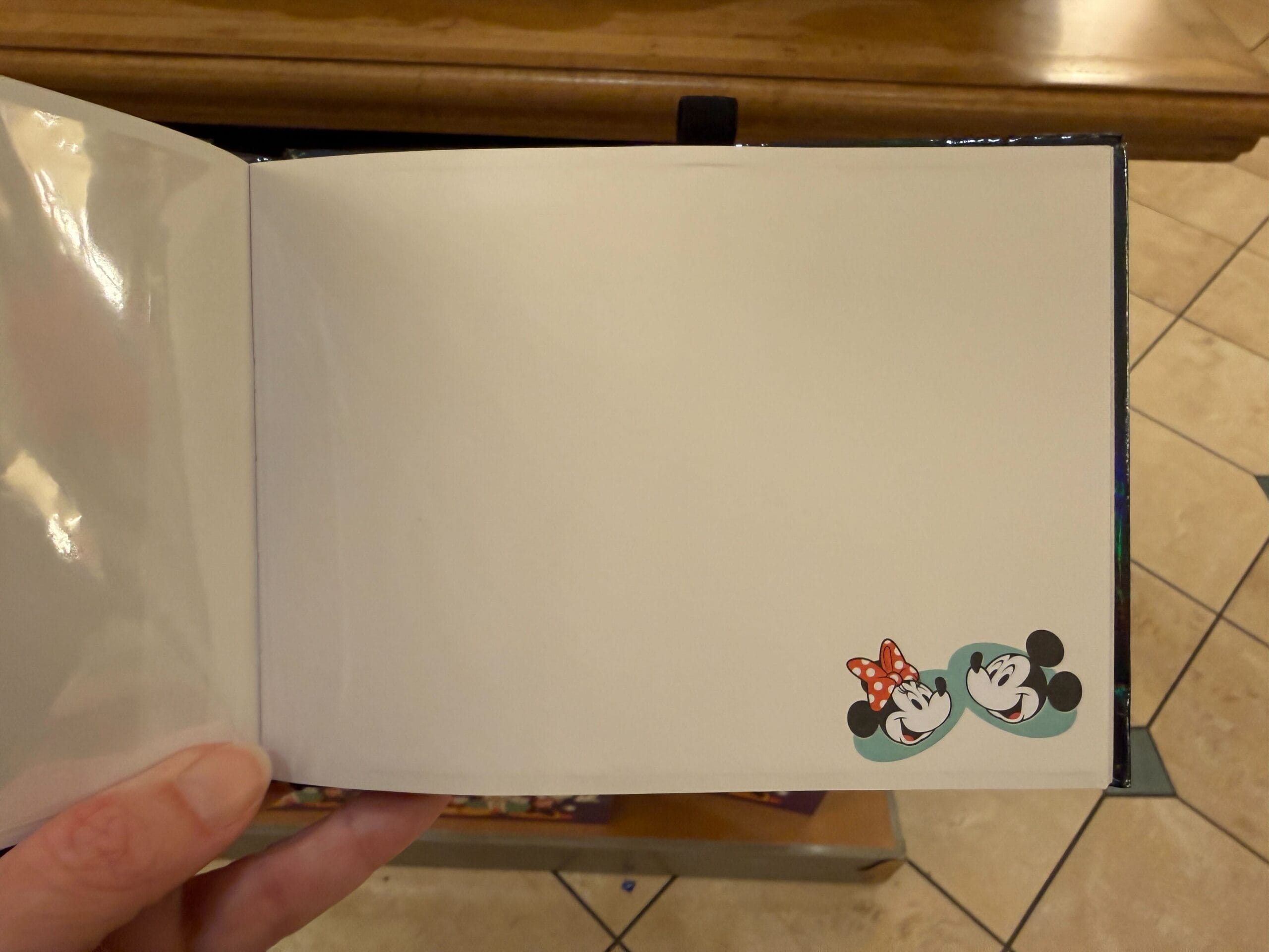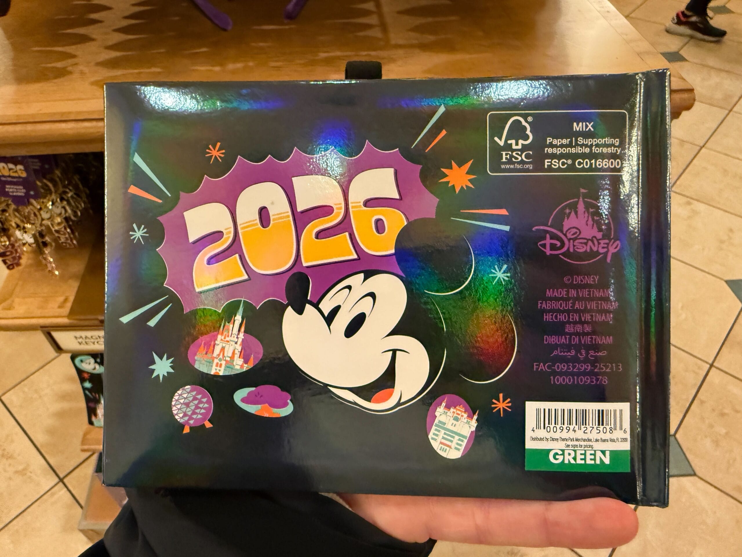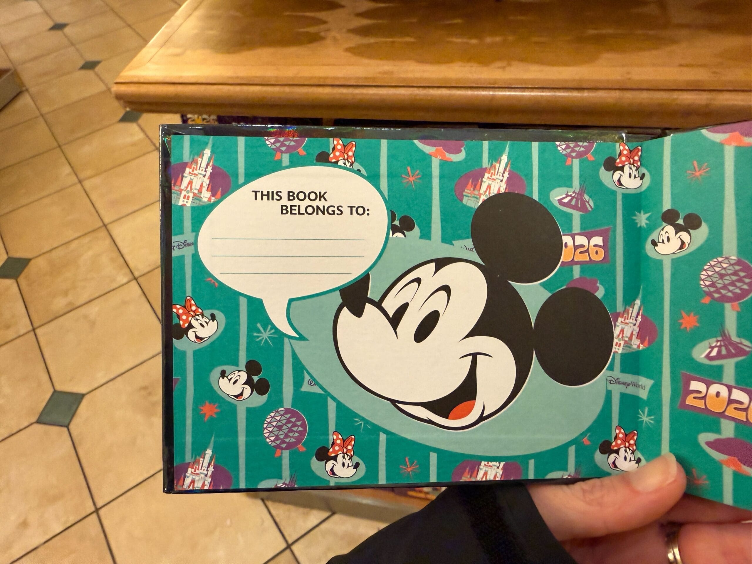 The autograph book has a shiny blue finish. The front features Mickey and Friends in front of a red, green, and white version of Cinderella Castle. Mickey’s face is on the back cover with “2026” and the four park icons. The interior lining flyleaves are green pages with stripes, icons, Mickey, and Minnie. On the inside cover is Mickey with a speech bubble that reads, “This book belongs to:”