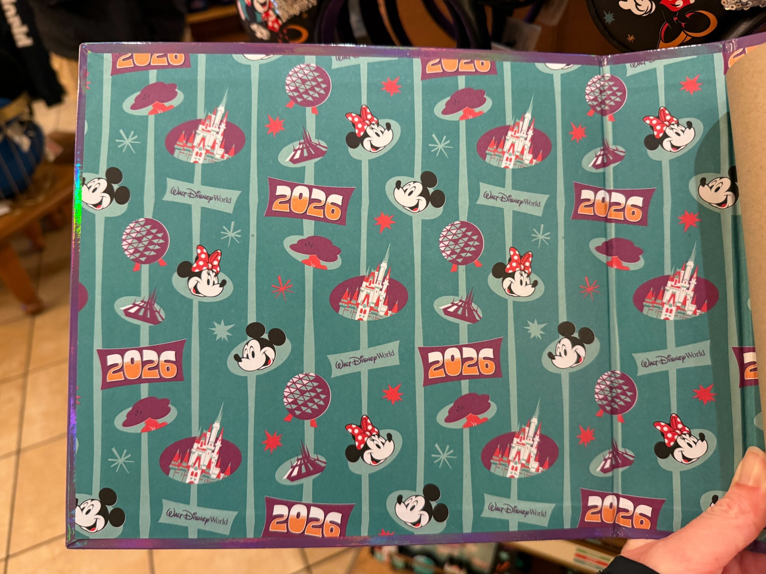 The book is purple with an aqua, orange, and white accents. Mickey and Minnie stand in front of Cinderella Castle. An orange banner with “2026” and “Walt Disney World” text are beneath them. The back and flaps have a similar design. Inside, an allover print of Mickey, Minnie, and park icons cover the teal background.