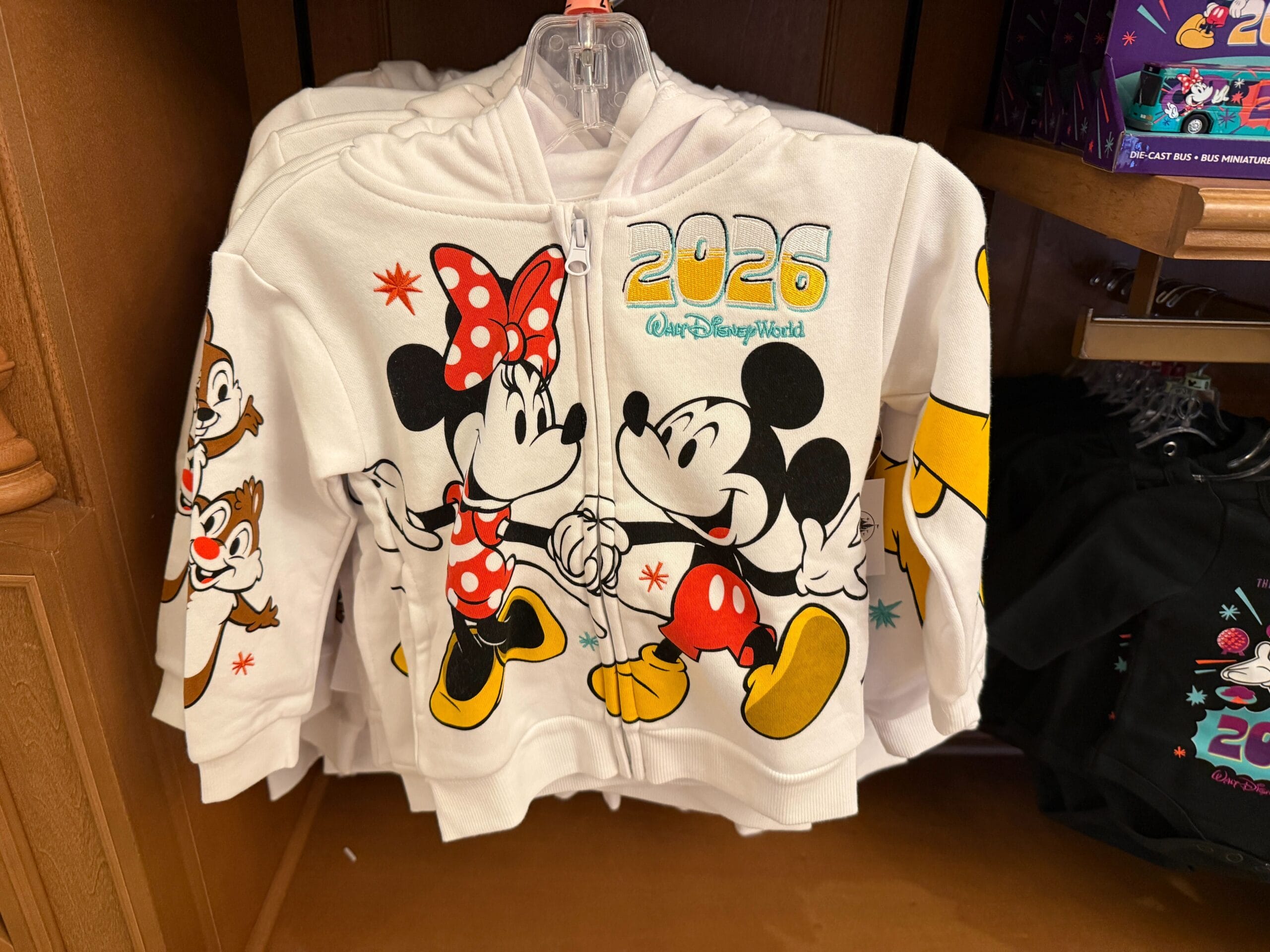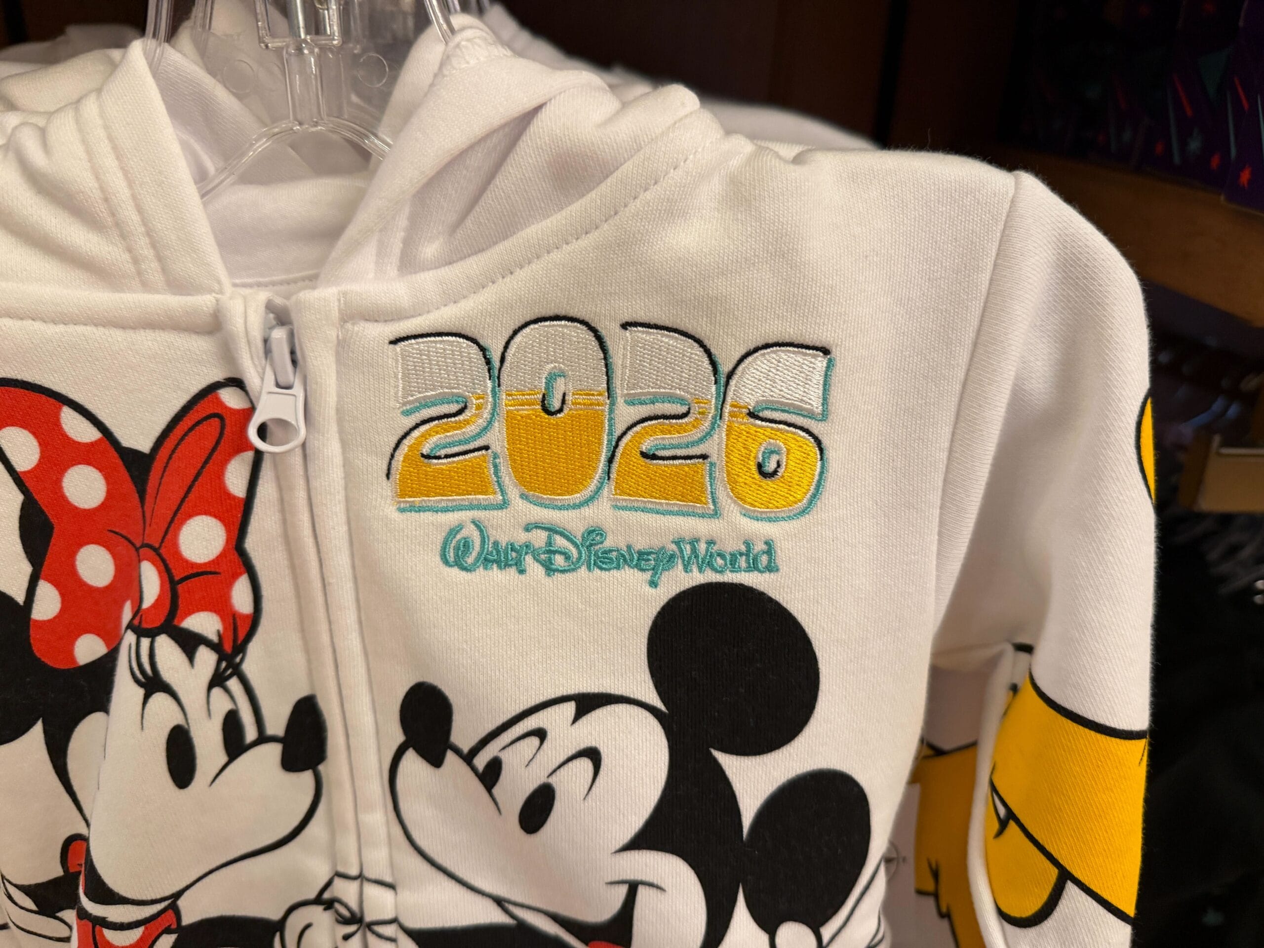 The youth hoodie is white and zips up. Mickey and Minnie are pictured on the chest. “2026” is made of embroidered appliqués on the left chest above the Walt Disney World wordmark.