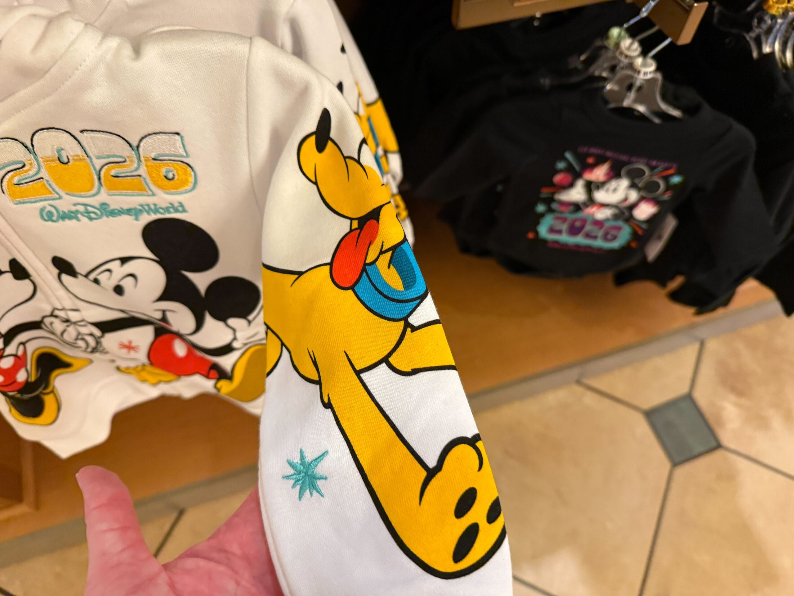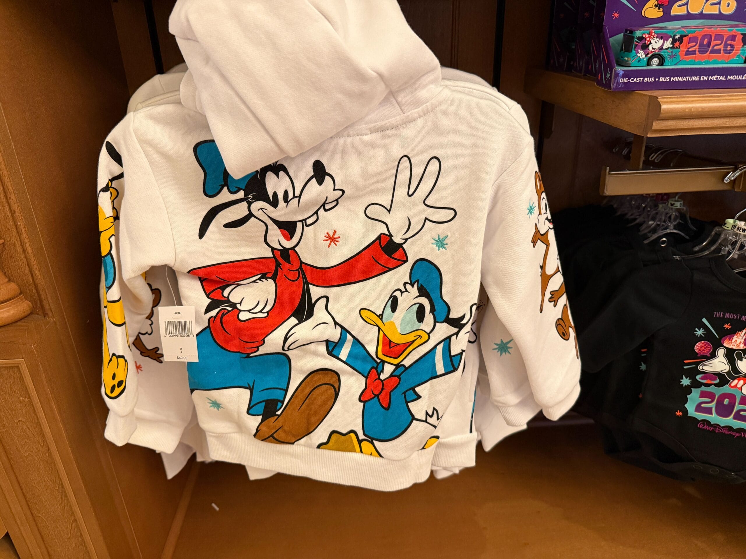 Donald and Goofy are on the back. Pluto is on one sleeve while Chip ‘n’ Dale are on the other. There are embroidered stars around the characters.