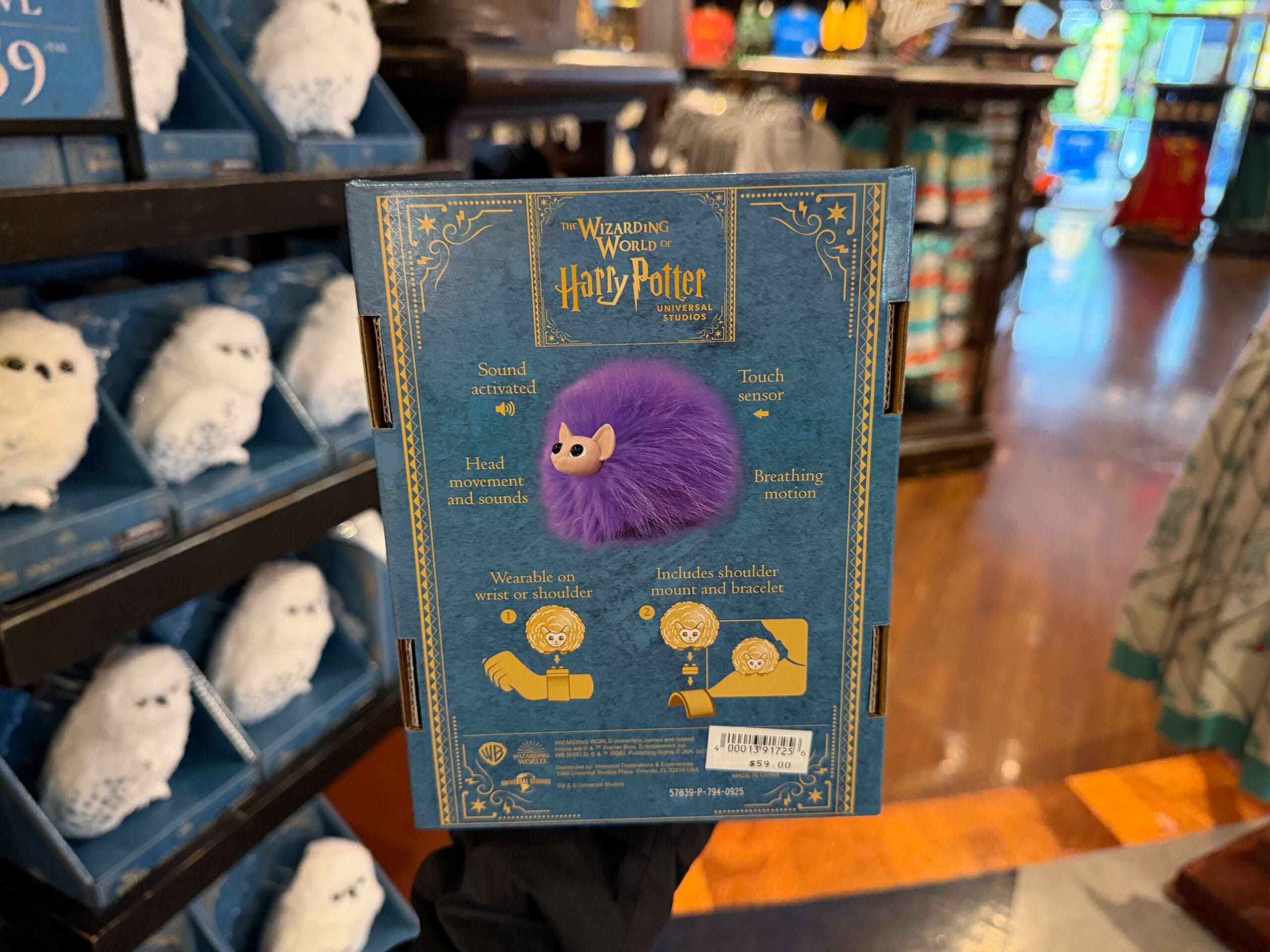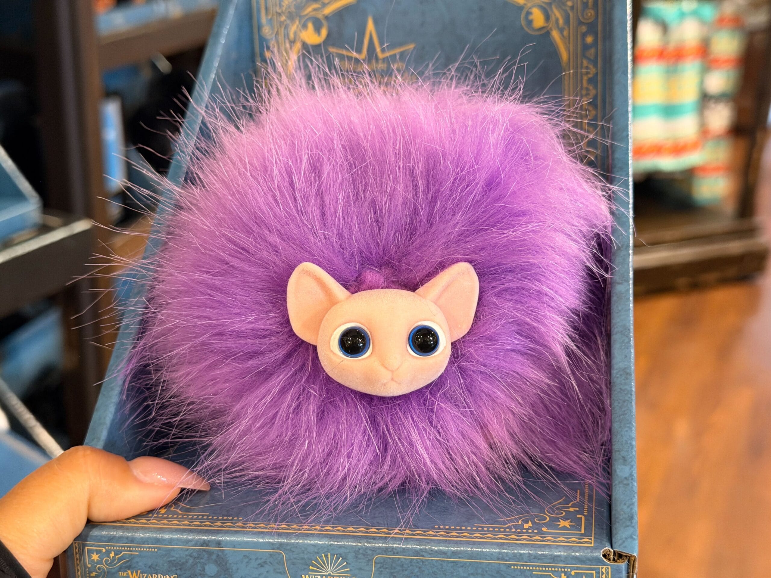 We found the wearable pygmy puff in Universal Studios Store at Universal Studios Florida. The toy is a purple fuzzy puff ball. It’s a little smaller than the standard pygmy puff plush.