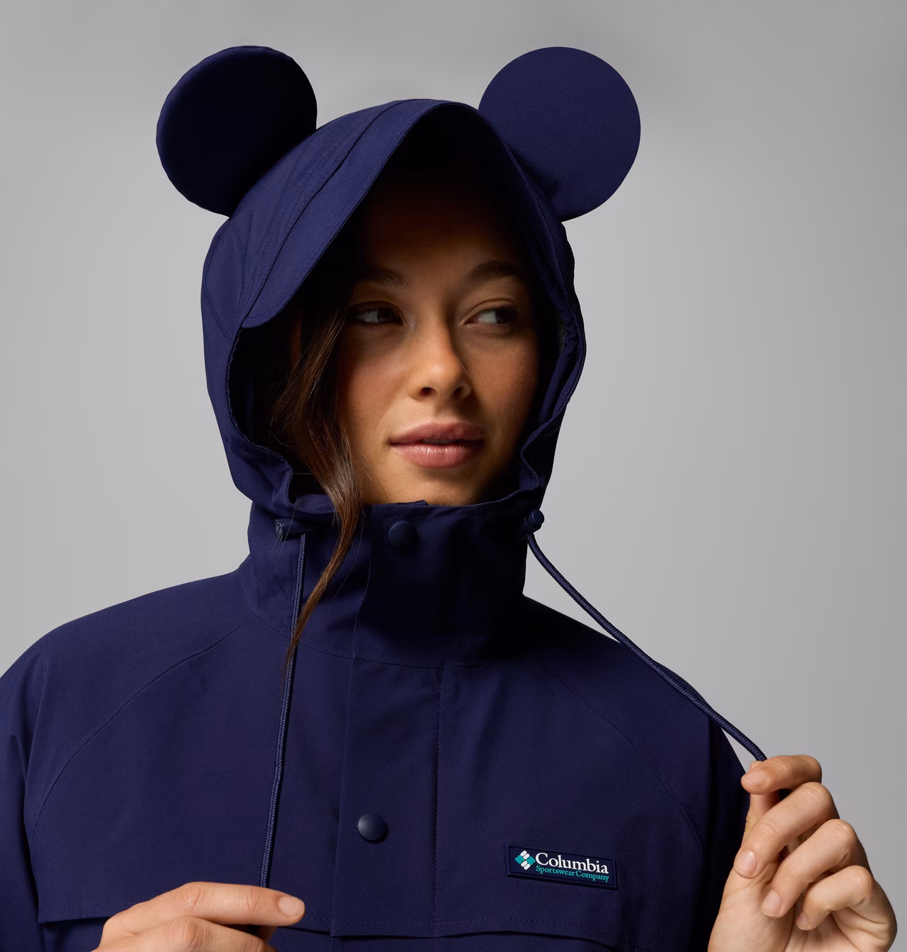 The jacket is made with Columbia’s waterproof breathable Omni-Tech fabric. It’s dark blue and has snap-front closures with flap covers, hand pockets with flaps and snap fasteners, adjustable elastic cuffs, and a drawcord-adjustable hem. The drawcord adjustable hood features 3D Mickey ears and a peaked brim. It is also available in fuchsia.