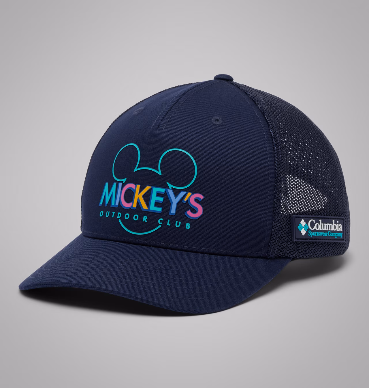 The navy hat features an adjustable back closure that secures the fit. It has a mesh back for breathability and a Mickey’s Outdoor Club graphic.