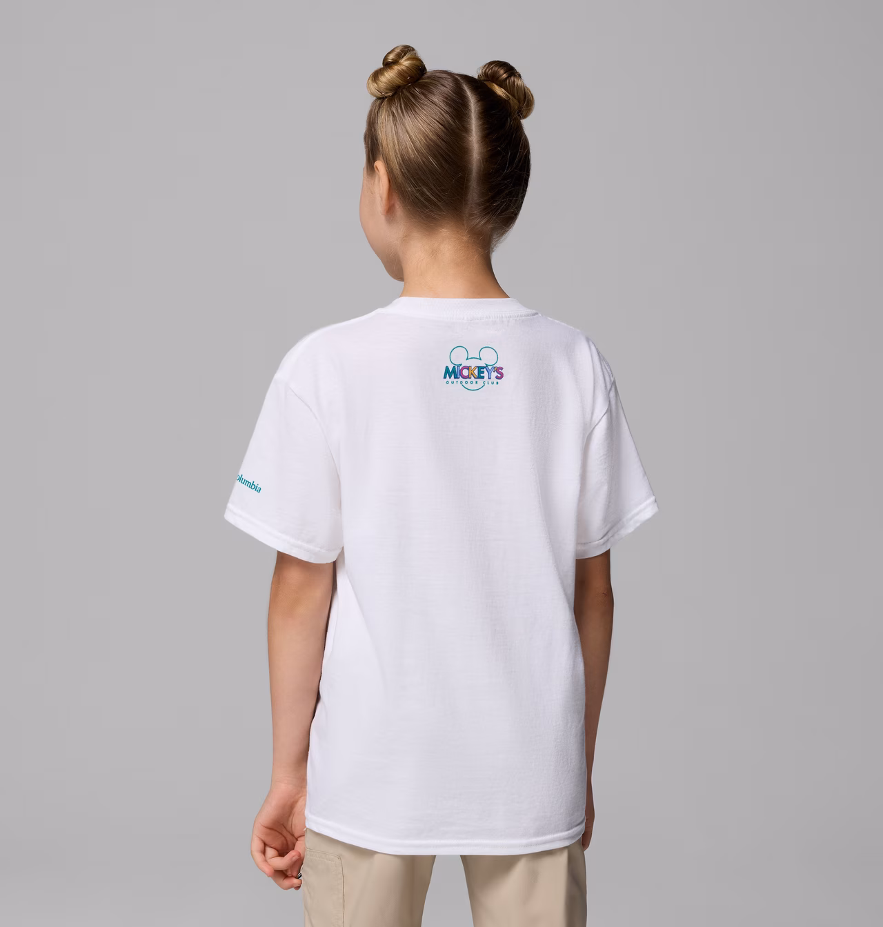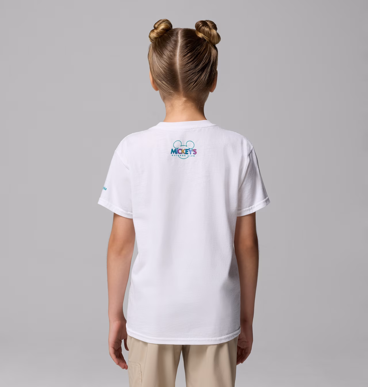 The white tee has a custom graphic inspired by Disney’s Mickey & Friends on a ski vacation. Mickey appears to ski down a slope surrounded by Mickey’s Outdoor Club text.