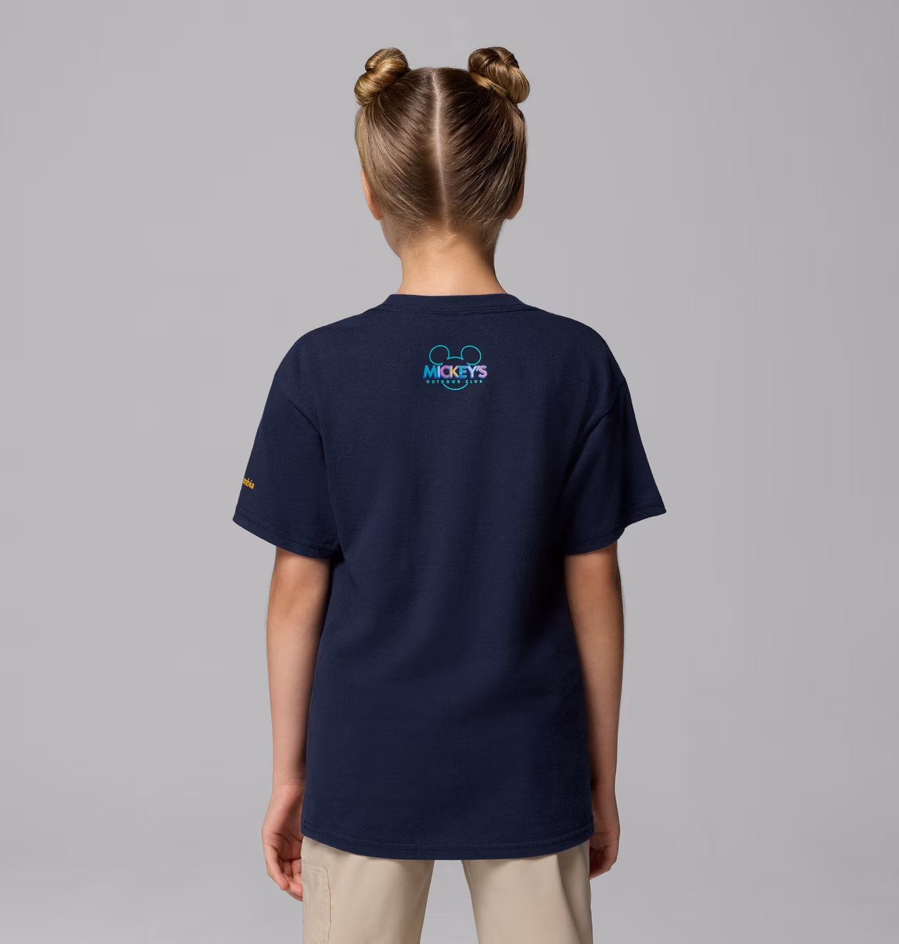 This navy kids’ shirt has a 90s style image of Mickey skiing. Confetti surrounds the tiered image.
