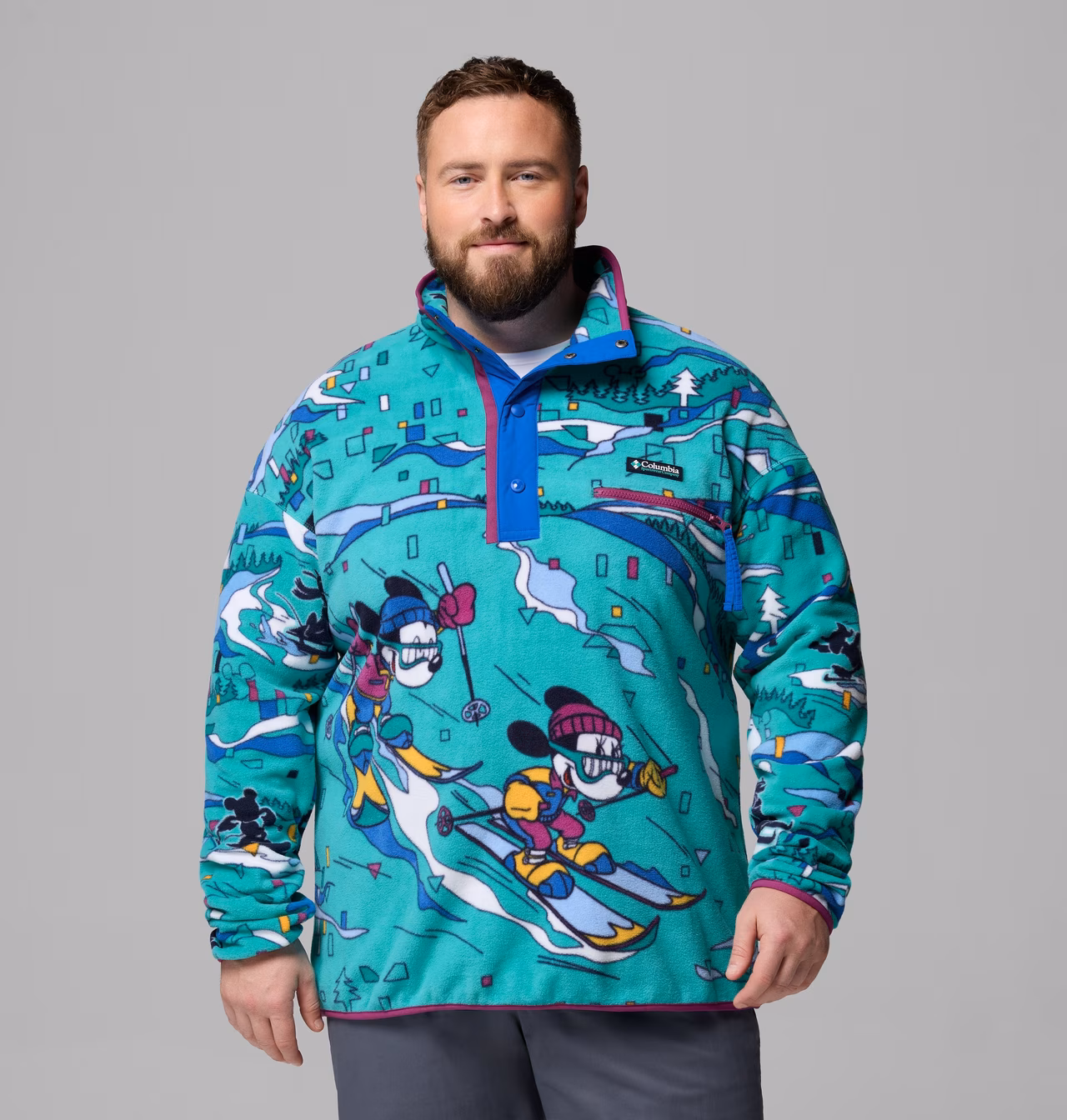 This pullover has all the same features but a longer torso. Full color art of Mickey and Minnie is on the front, while the rest features the silhouettes of their friends skiing, sledding, and skating. It has a half-snap closure. Both the men’s and women’s versions come in white and blue.