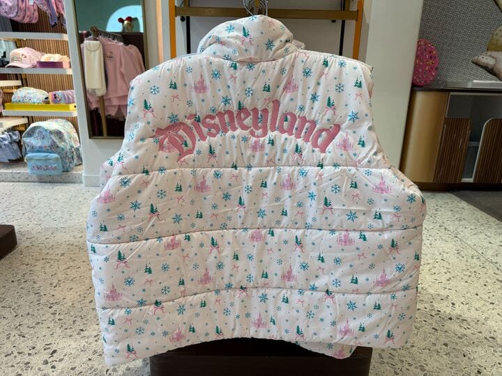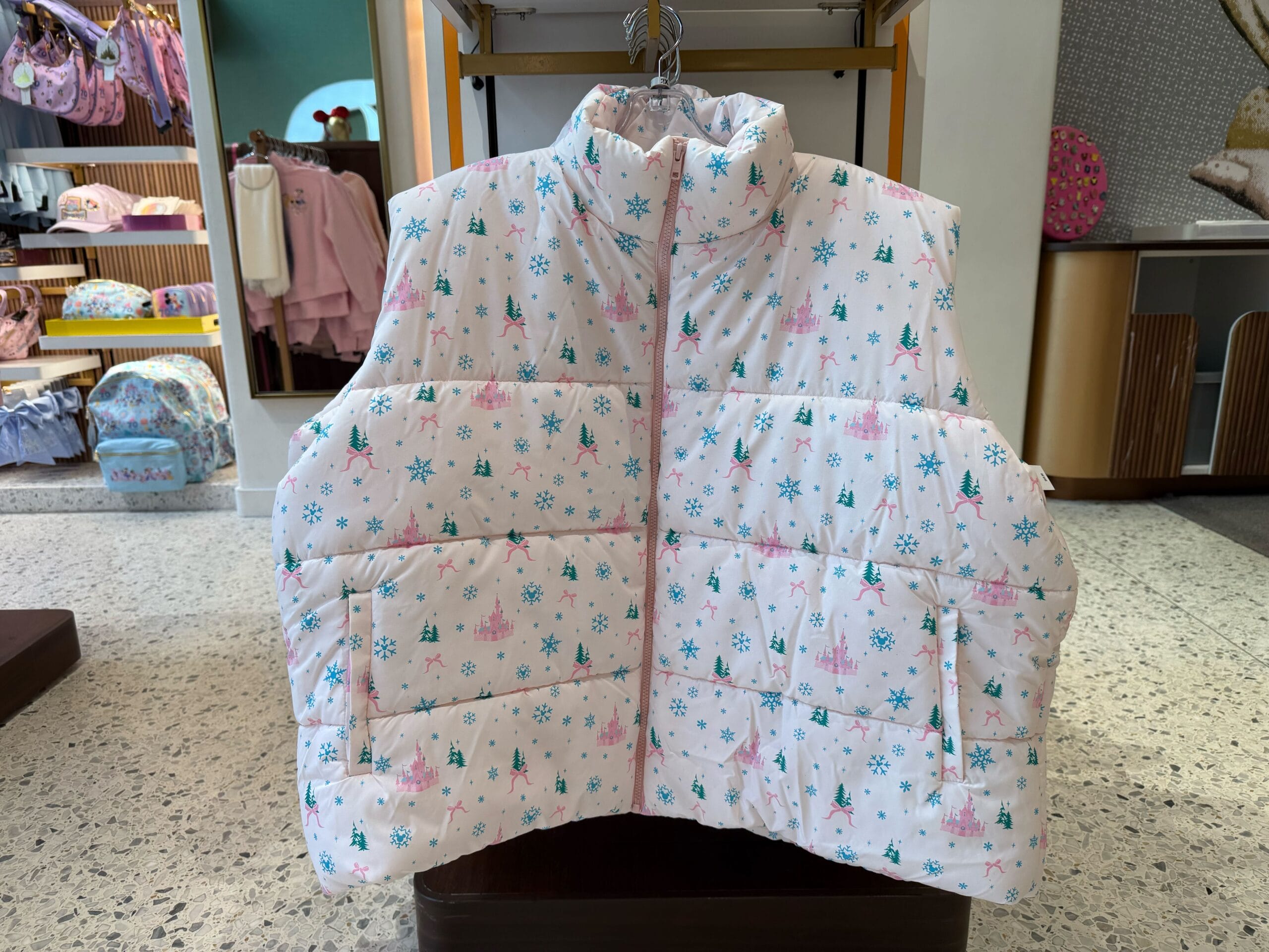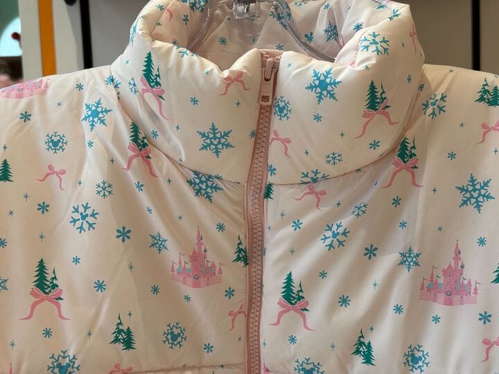 The vest is white with an all-over print. The Fantasyland Castle and bows are pictured in pink among blue snowflakes and green trees. It has a pink zipper and two front pockets.