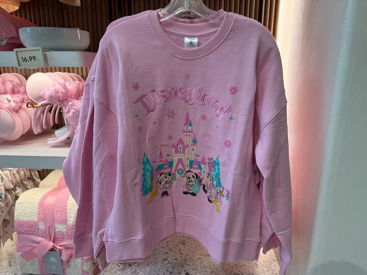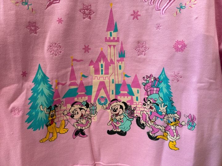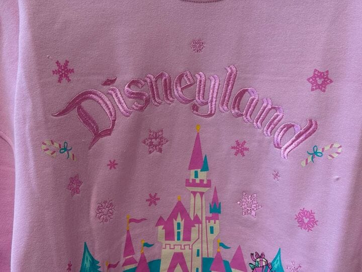 They’re gathered together in front of a stylized Fantasyland Castle with a wreath, situated between two trees and surrounded by pink Mickey snowflakes. The Disneyland logo is embroidered in dark pink in an arc overhead between two candy canes. The back is plain.