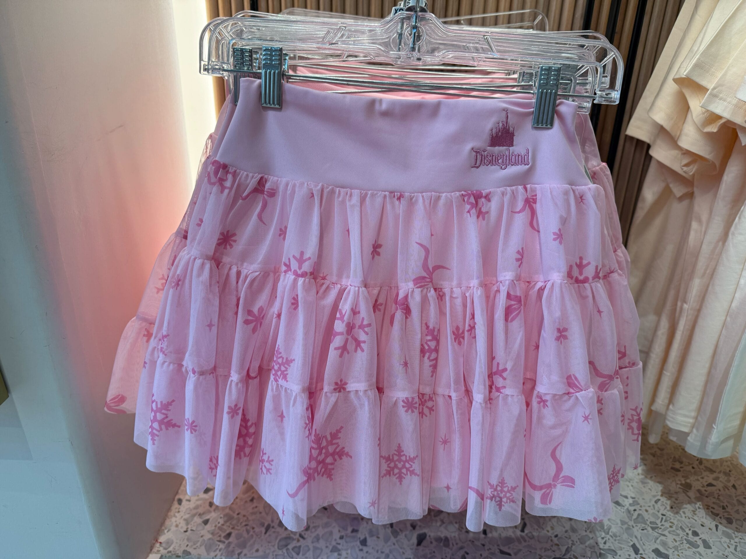 The top layer of this pink skort is a tulle tiered skirt. The pattern features snowflakes and bows in darker shades of pink. It has a stretchy waistband with Disneyland” and the castle silhouette embroidered on one side. Built-in shorts are under the skirt.