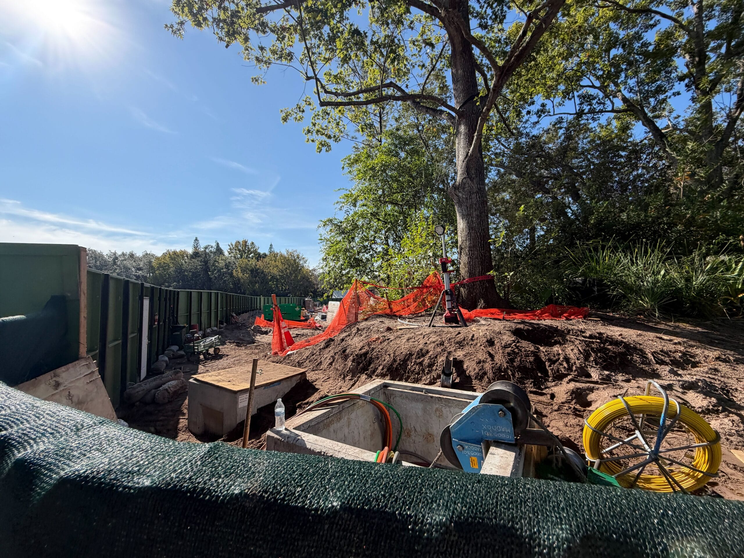 Behind some scrim is a swath of dirt with some concrete walls in the ground for utilities.
