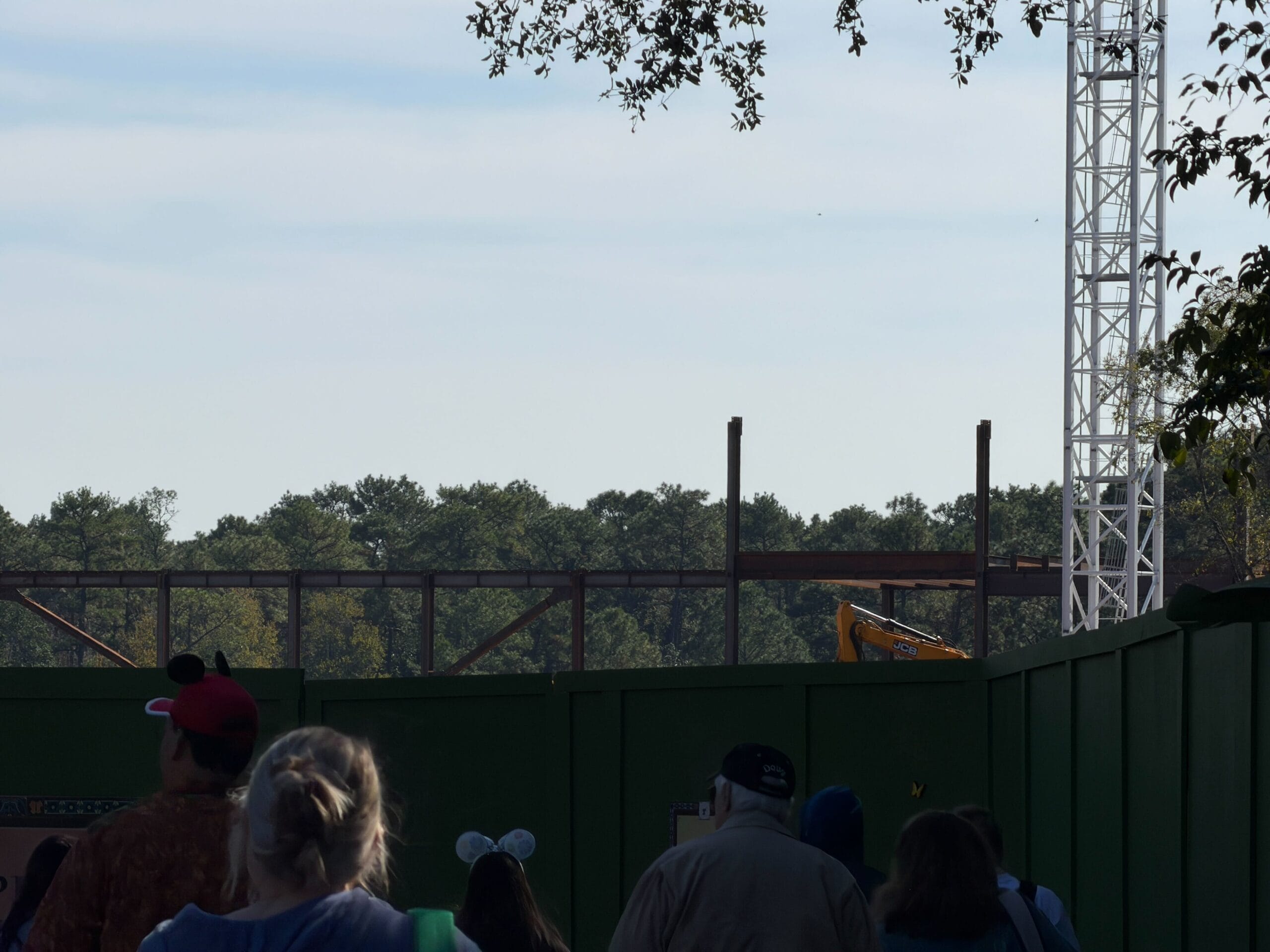 Last week only one tower of framing was in place. Now there is a wall of vertical and horizontal steel beams. The structure is taking place on the former Dino-Rama site, near the Chester & Hester’s Dinosaur Treasures buildings, which will be re-themed for the new land.