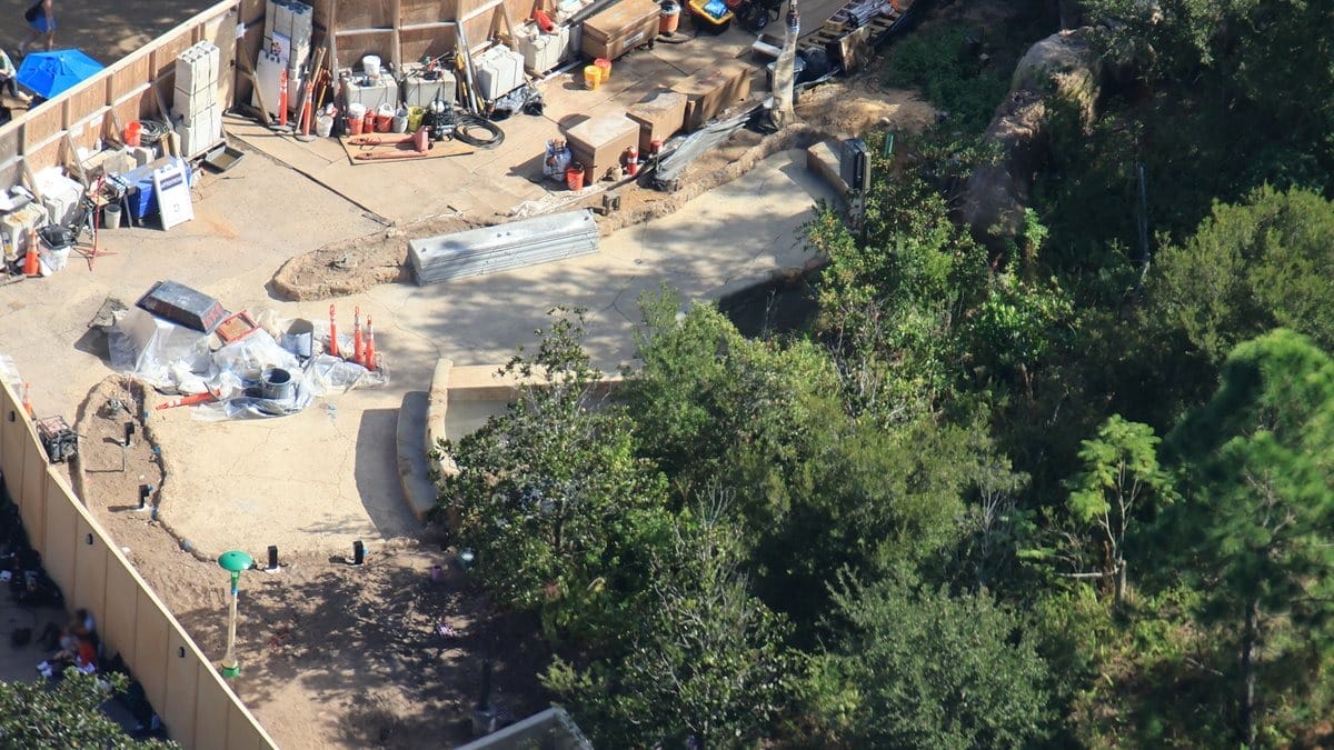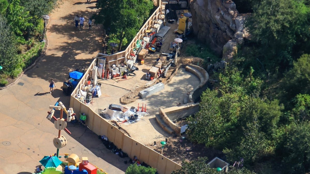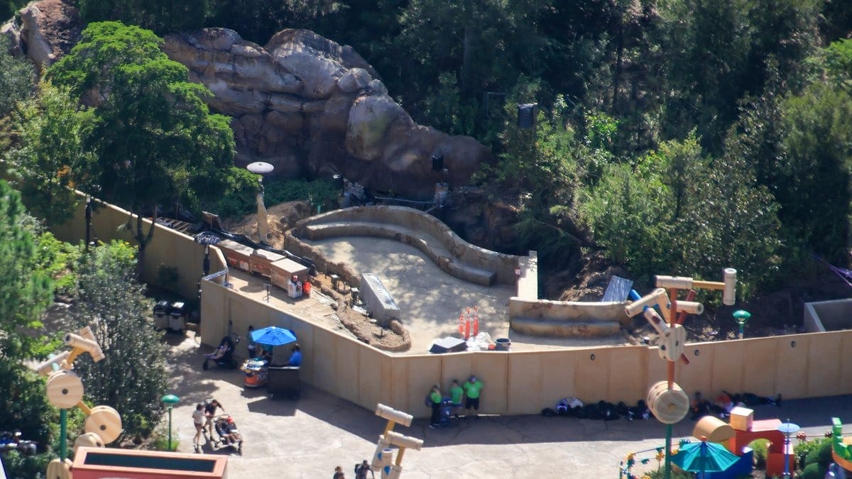 The construction zone is next to Alien Swirling Saucers, across from the new Toy Story Land snack kiosk, which is still behind rolling planters. Construction walls went up at this corner of Star Wars: Galaxy’s Edge in July, after the area was used for temporary seating during Woody’s Lunch Box construction. We can now see new short concrete walls lining the edge of the Batuu forest.