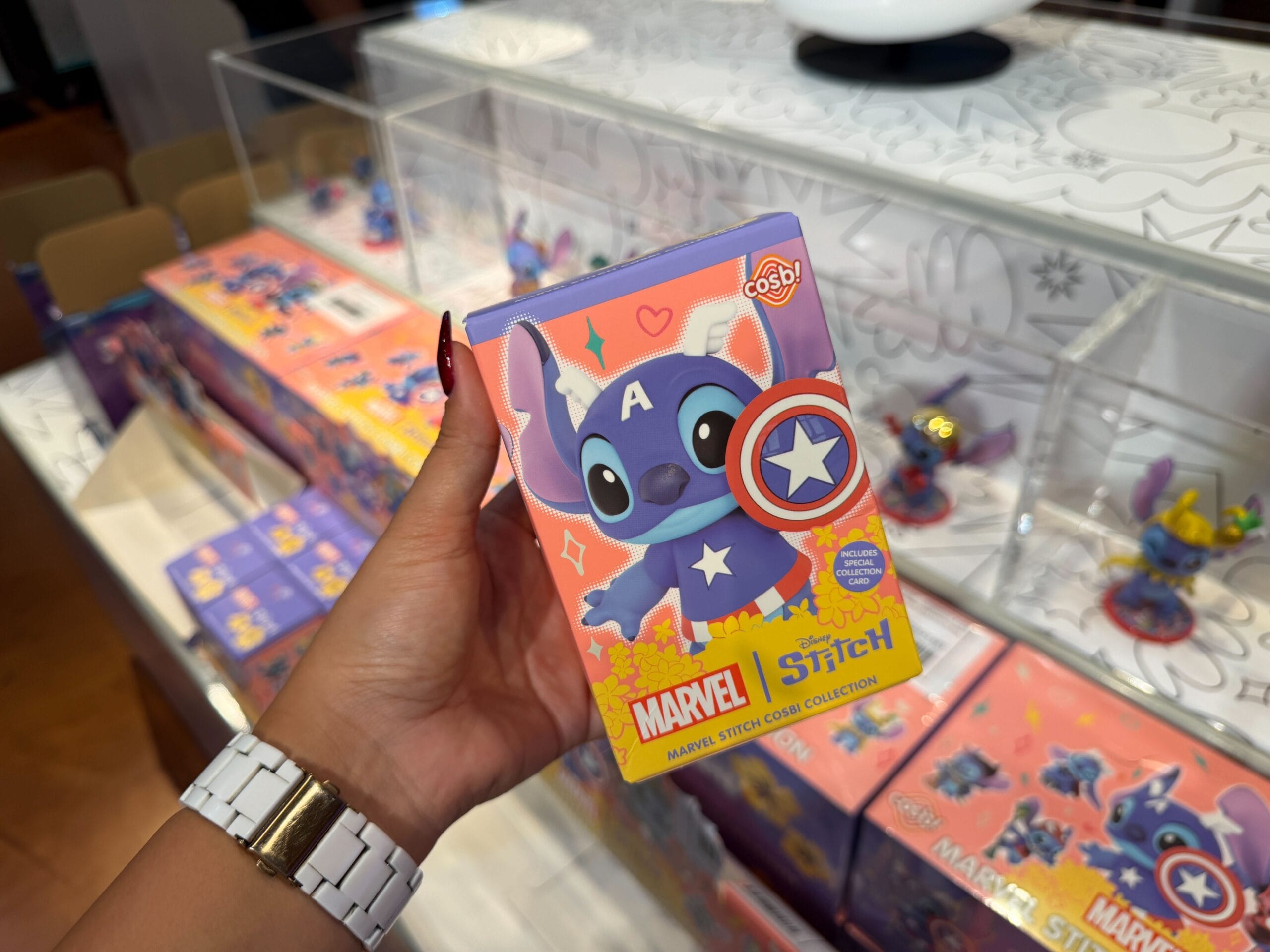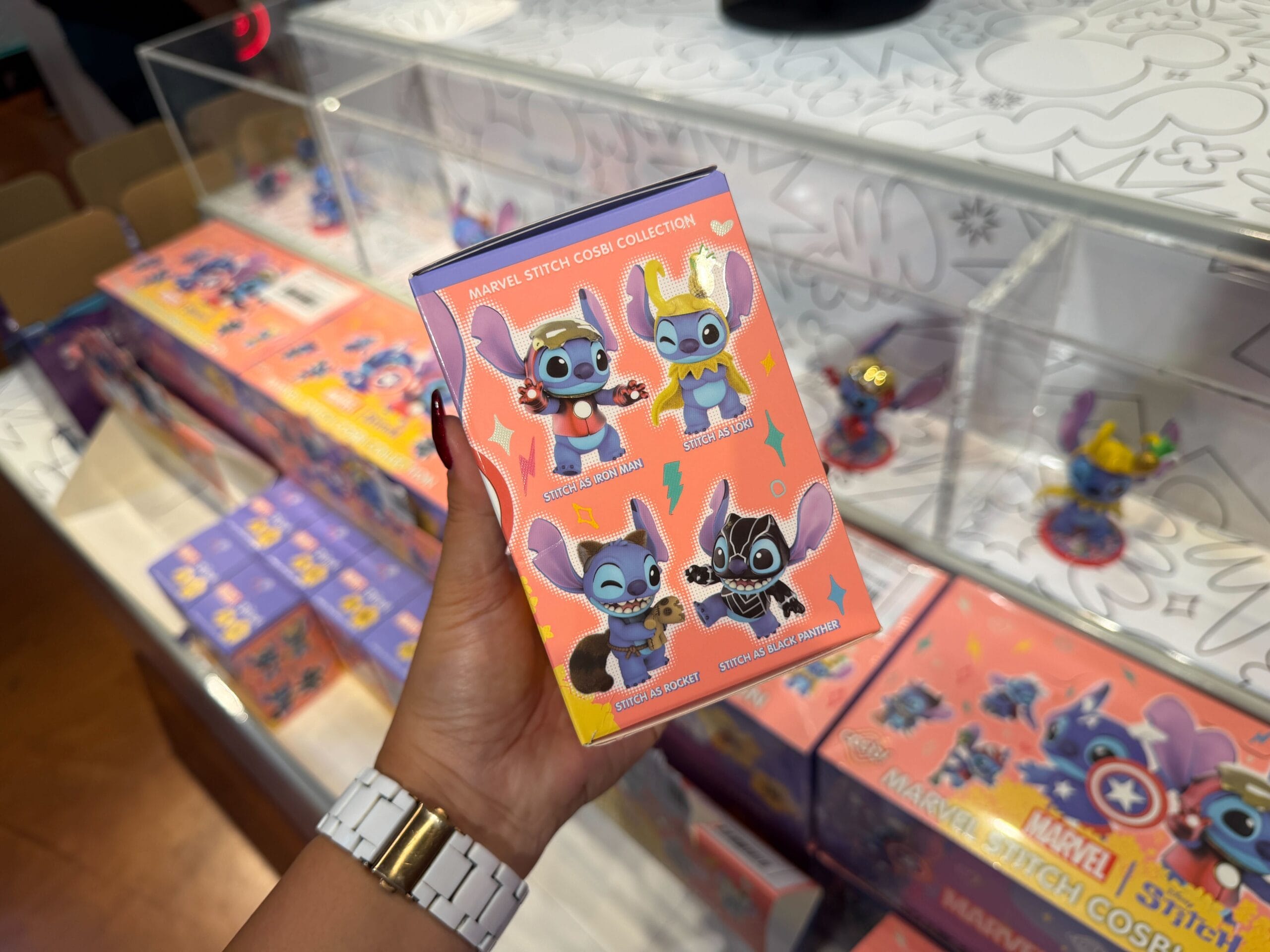 Options include Stitch as Iron Man, Loki, Rocket, Black Panther, Thor, Doctor Strange, and Spider-Man. An either mystery figure is available.