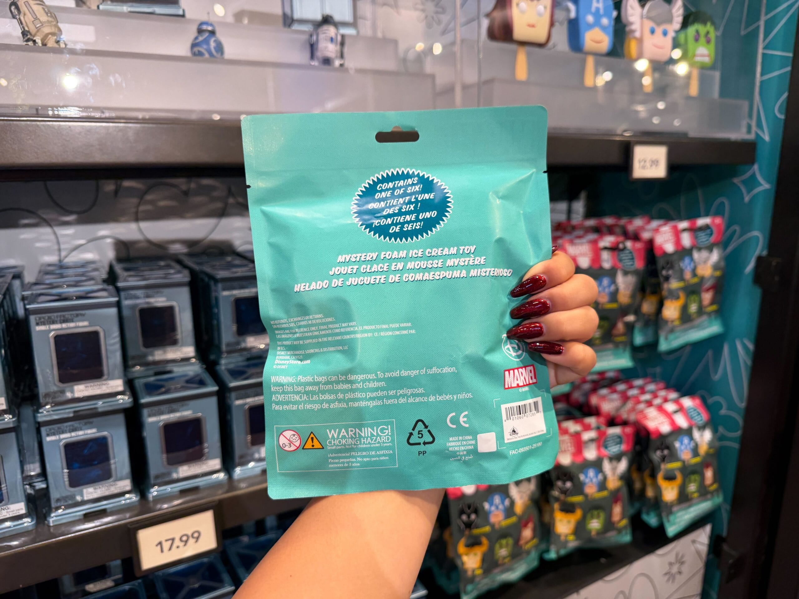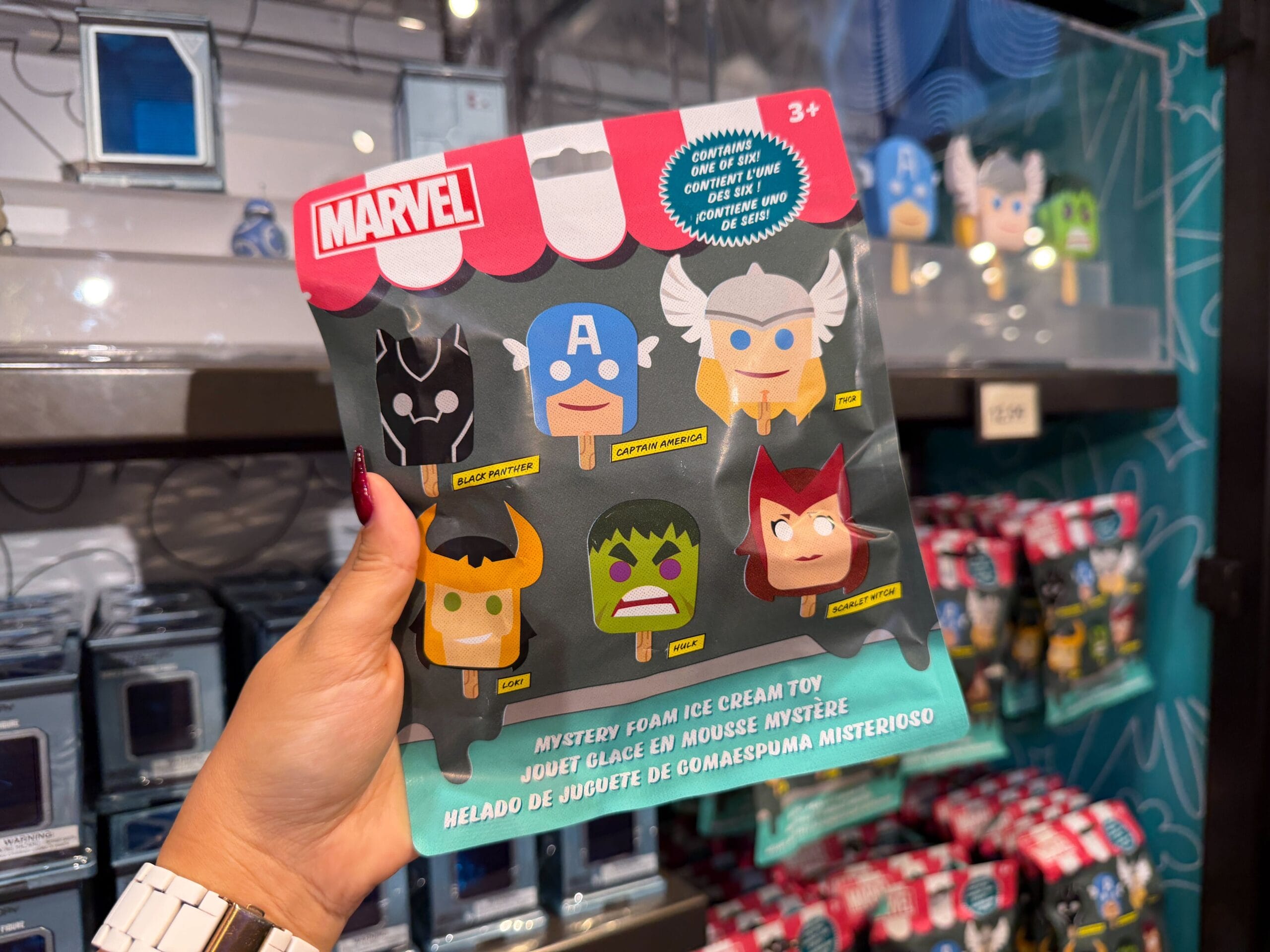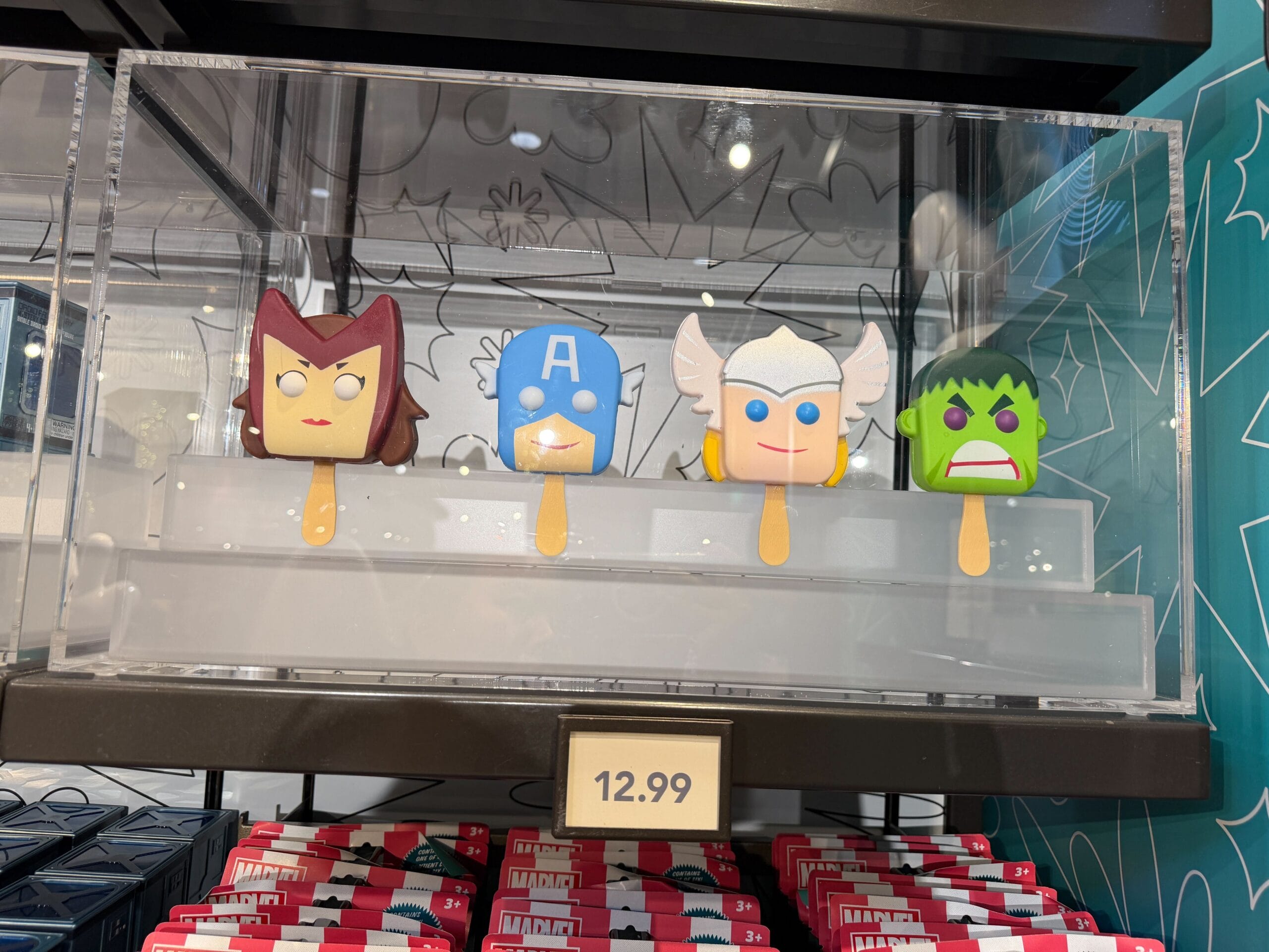 Next up is a set of blind bag Marvel Character Ice Creams. The Scarlett Witch, Captain America, Thor, and The Hulk are displayed in the store.