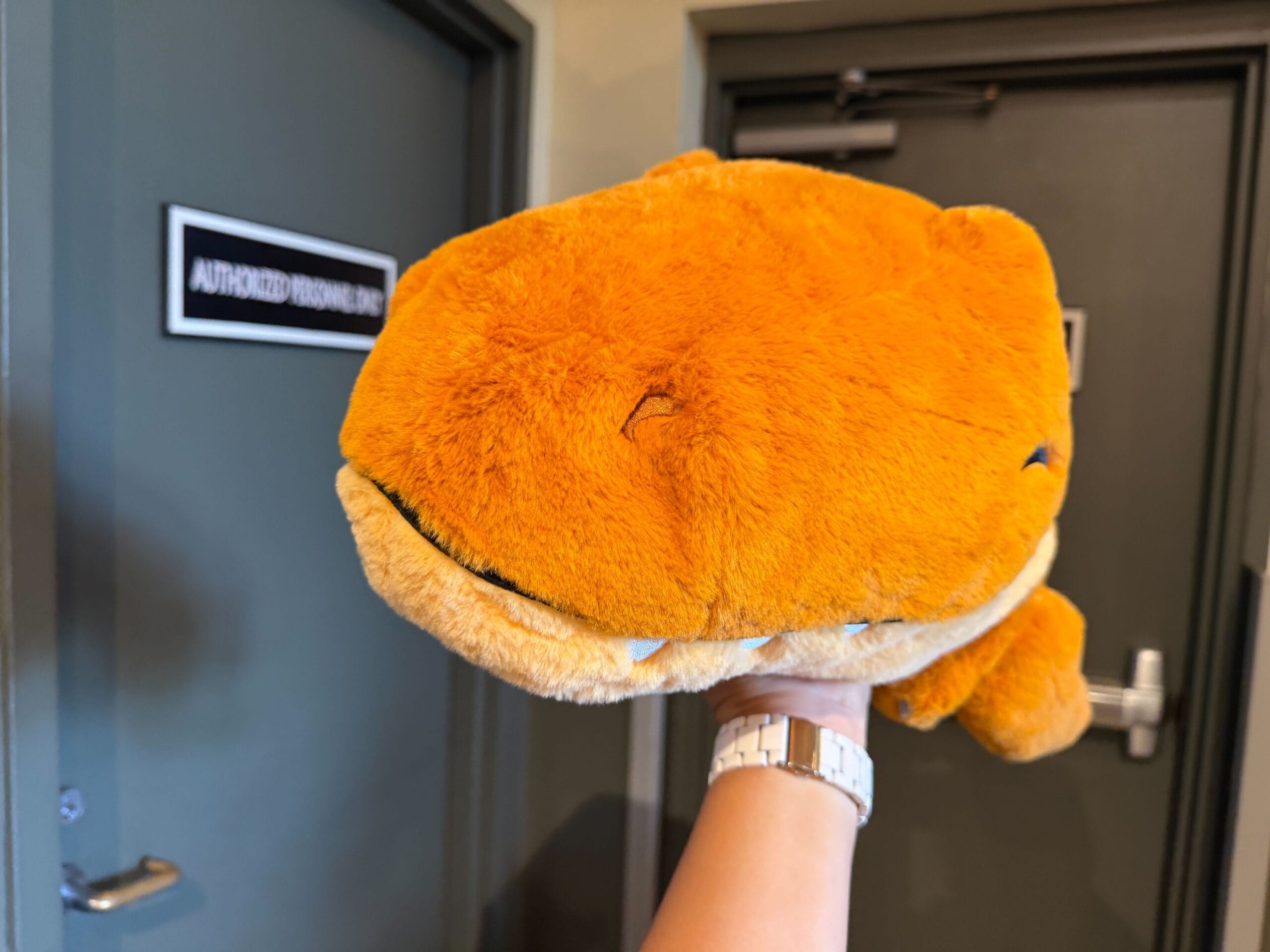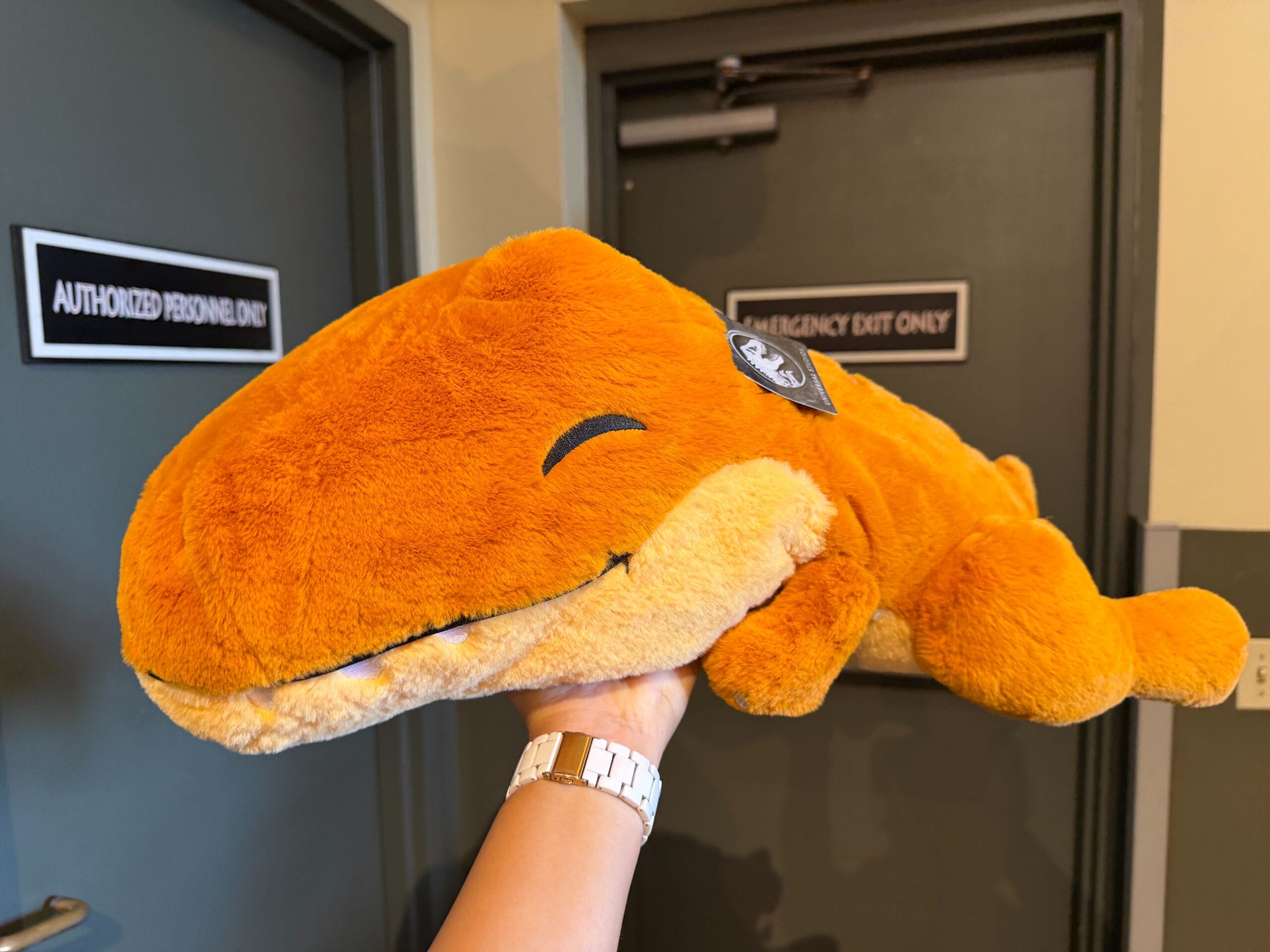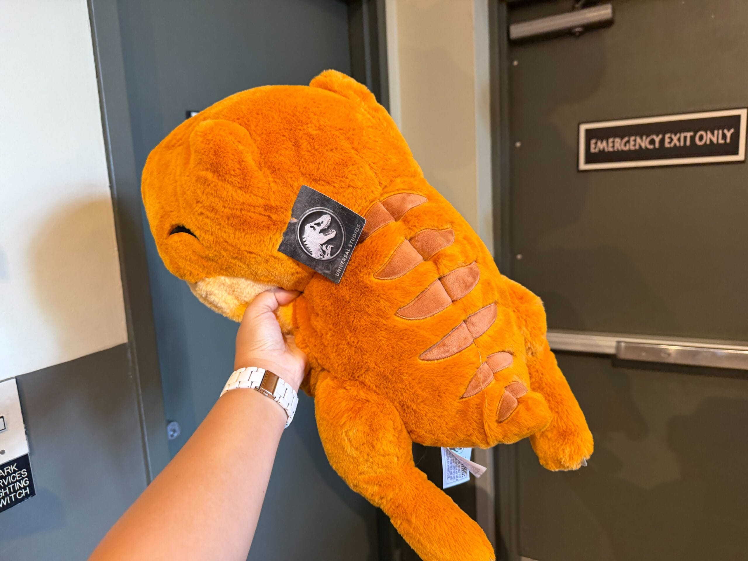 The T. rex plush is russet orange with a beige underside. It appears to be inspired by Rexy, the main T. rex of the Jurassic Park and Jurassic World franchise but is lacking her scars.