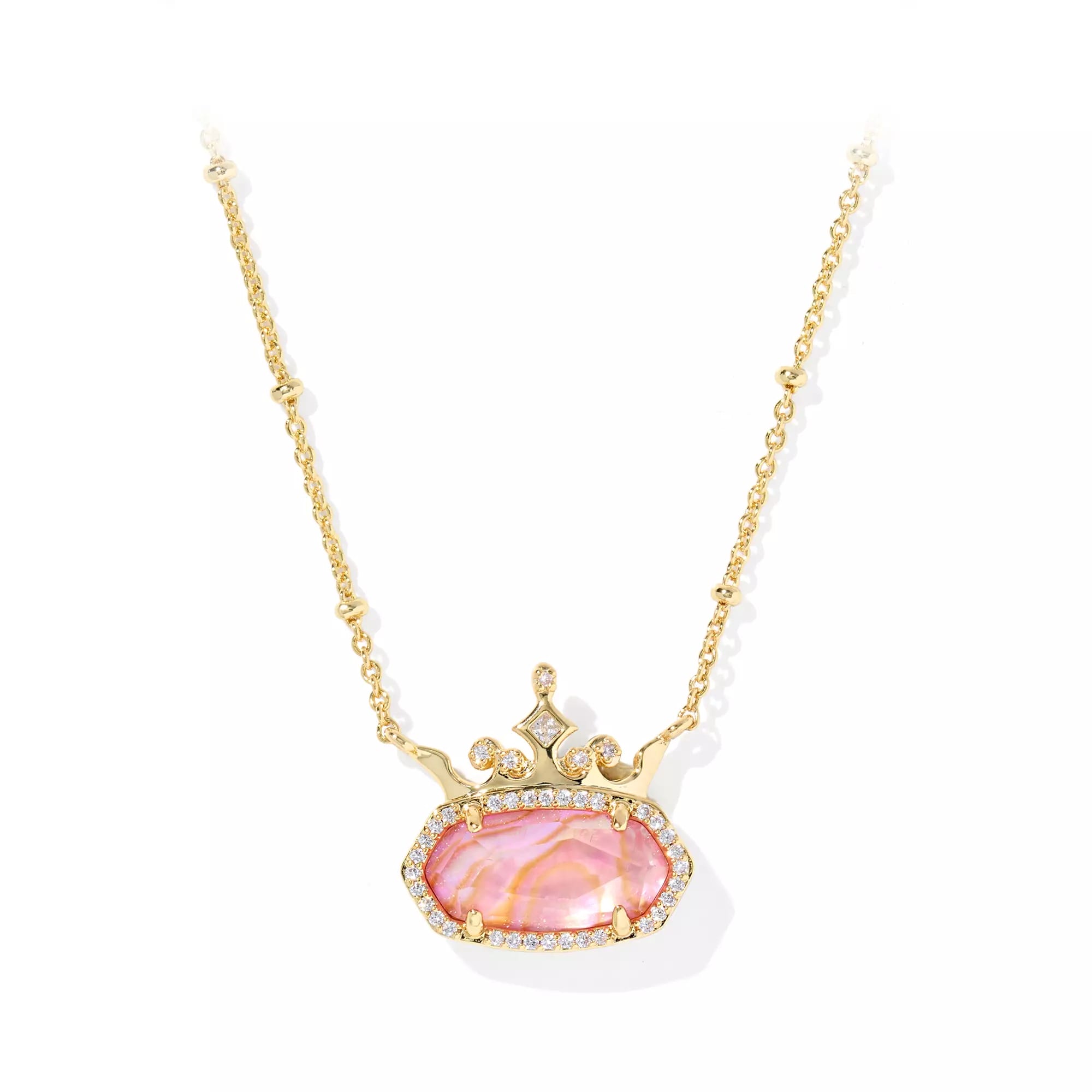 This pendant has a crystal-studded satellite chain featuring multiple Mickey charms. Each charm holds a white CZ crystal. At the bottom of the chain is a large Elisa pendant with an iridescent drusy stone.