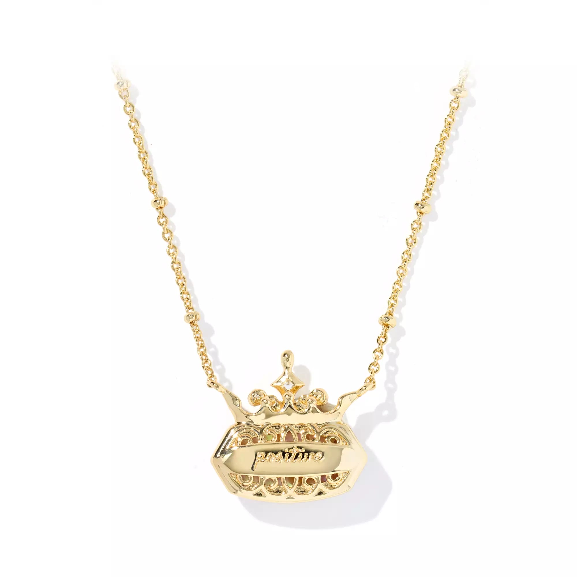 The necklace chain and pendant are brass with a 14k gold finish. An iridescent pink abalone is on the front of the pendant. “Positive” is on the back.