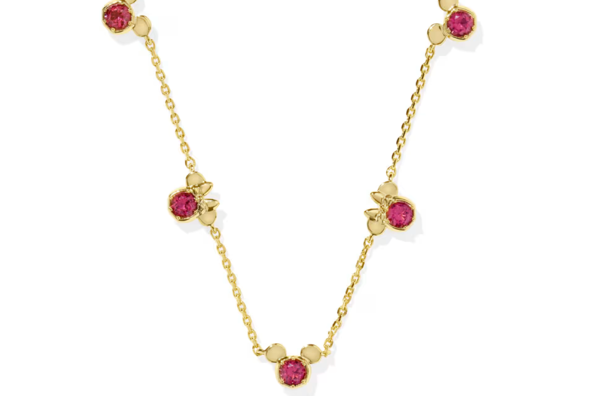 This 14k yellow gold crystal-studded chain features a lobster clasp with a single adjustable slider bead. There are three pendant options, each a primary color of Mickey Mouse’s appearance.