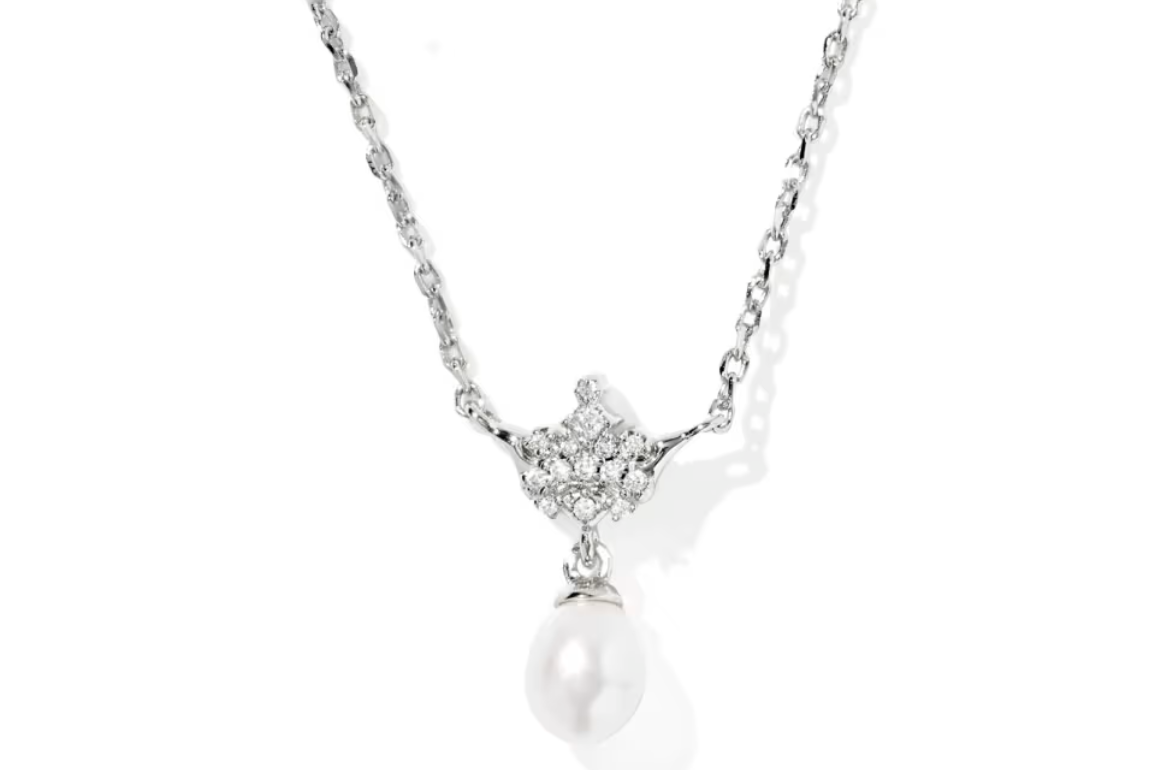 The silver short pendant necklace also features a crystal-studded satellite chain and a lobster clasp. The necklace is made of rhodium, and the only pendant option for this item is a white pearl.