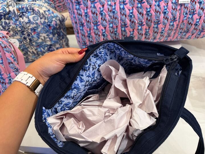 There is also a smaller, matching backpack. The interior lining of each pocket is designed with a dark blue leaf pattern, which is the same throughout the collection.