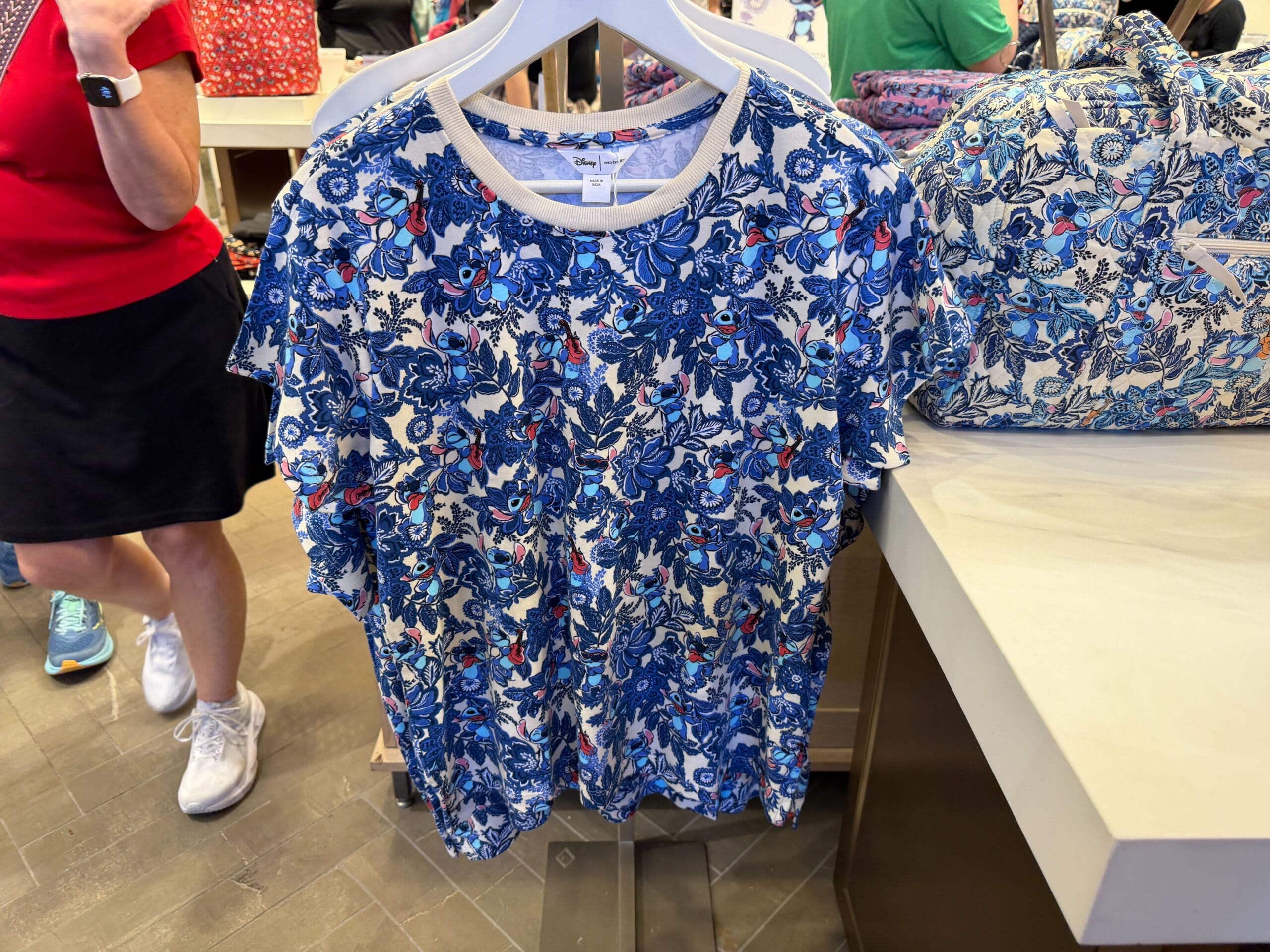 Moving to new items, there is a lounge shirt with an all over blue floral pattern. Stitch is interspersed among the flowers.