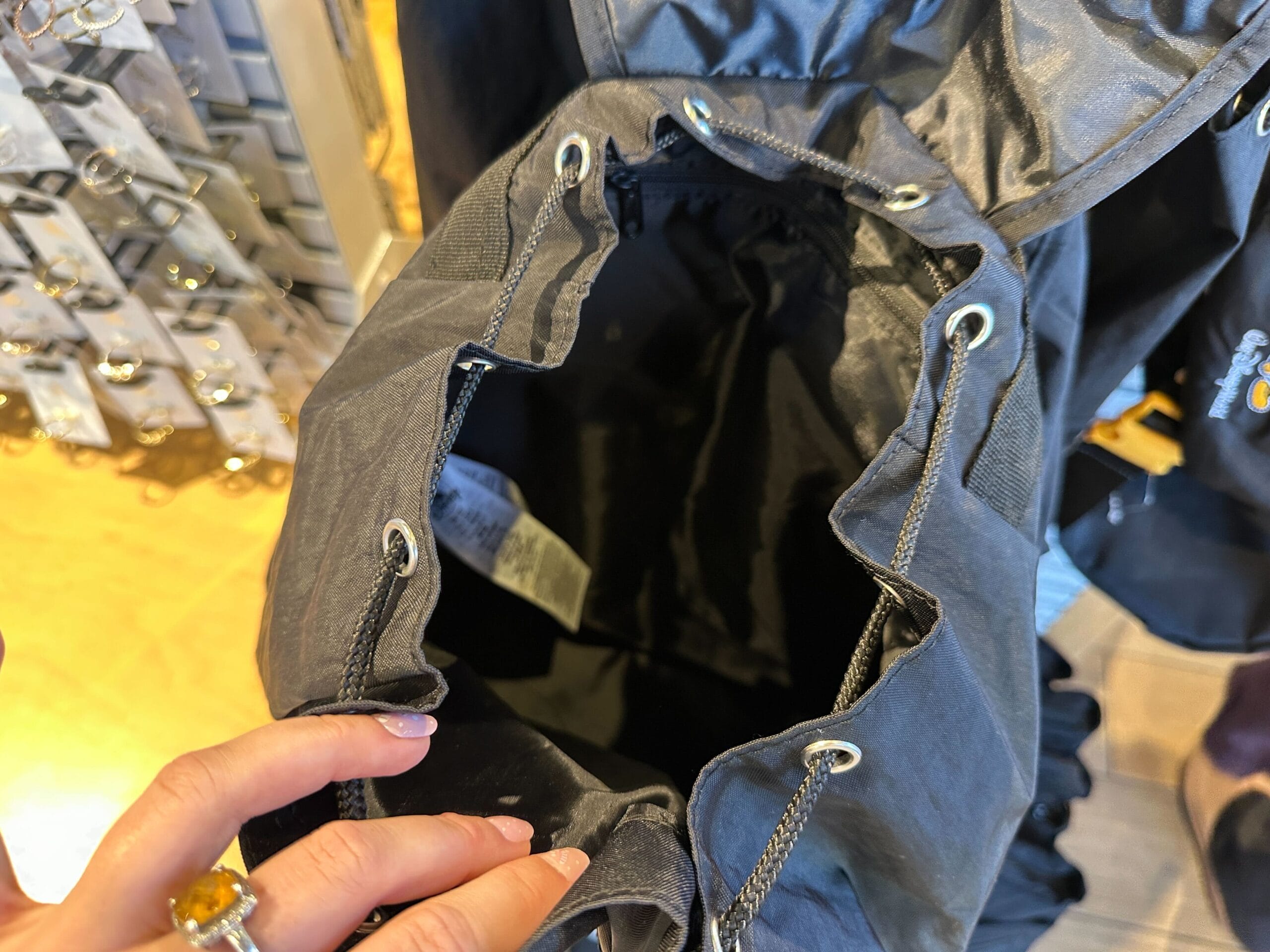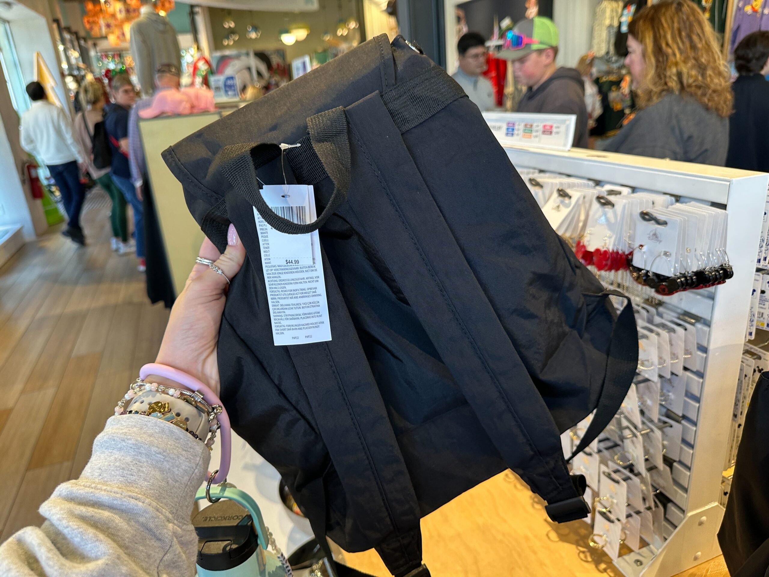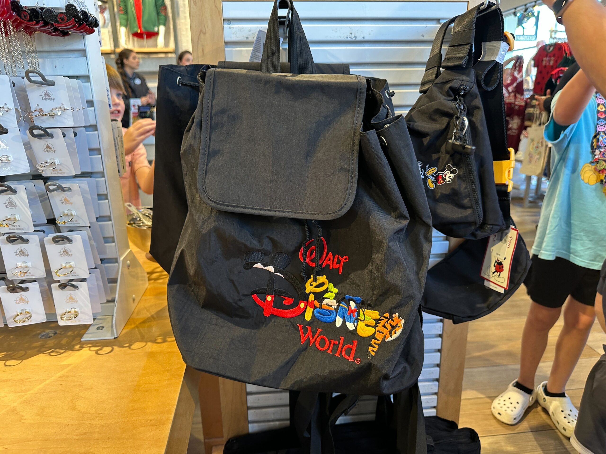 A black vinyl backpack is available at Walt Disney World with a retro embroidered design. We spotted this backpack in Disney Springs at DisneyStyle. It’s also available online.