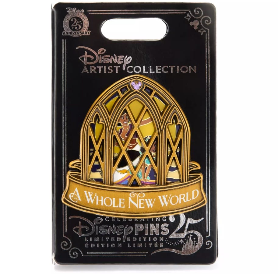Behind an antiqued, golden castle window frame with faceted lavender gems, this magnetic pin-on-pin reveals a cloisonné scene from Disney’s Aladdin featuring Aladdin and Jasmine on the Magic Carpet. There is a ”a whole new world” text banner at the bottom.