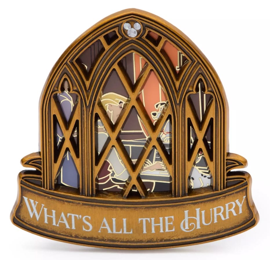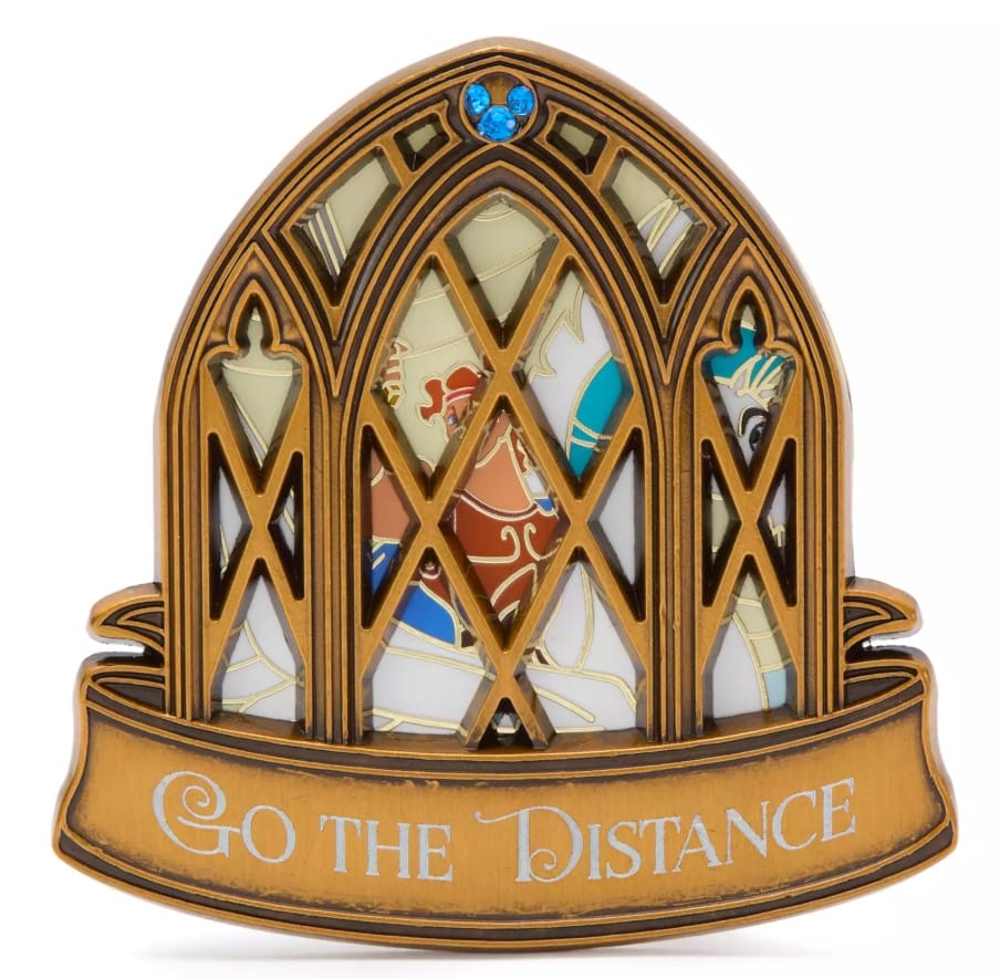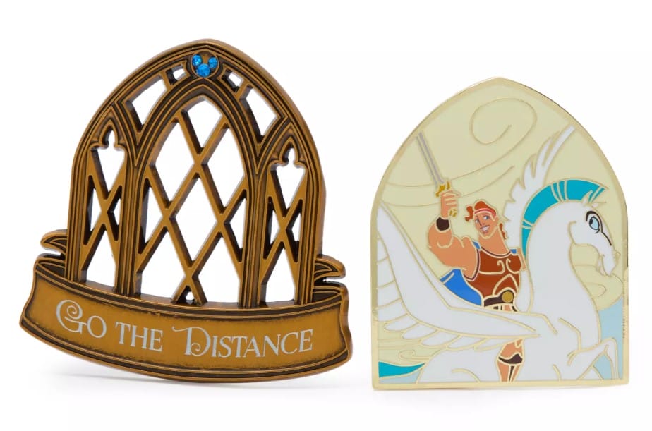 Behind an antiqued, golden castle window frame with faceted blue gems, this magnetic pin-on-pin reveals a cloisonné scene from Disney’s Hercules featuring Hercules and Pegasus.