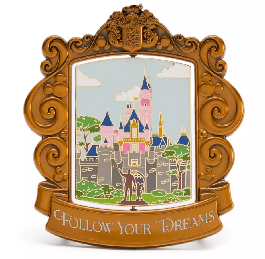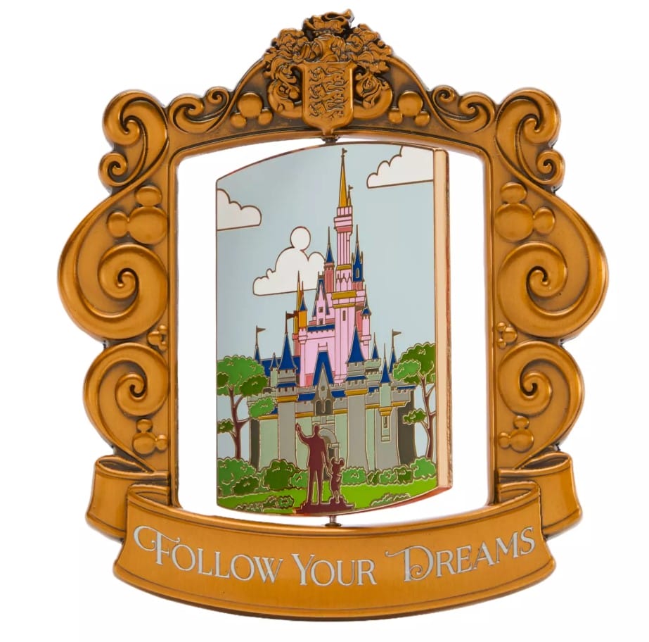 This pin has a filigreed, golden castle window frame with sculpted coat of arms. The spinning pin-on-pin features a cloisonné Sleeping Beauty Castle on one side and Cinderella Castle on the other. Both have a silhouette of the Walt and Mickey ”Partners” statue. ‘A ‘follow your dreams” text banner is at the bottom.