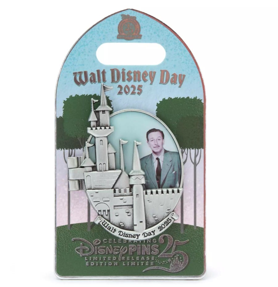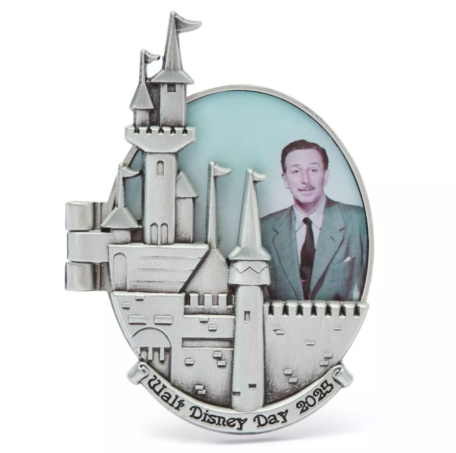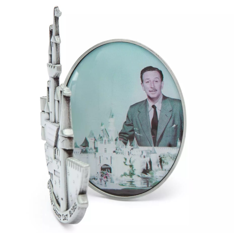 A bas relief Sleeping Beauty Castle sculpt frames a photo of Walt Disney for this limited release pin-on-pin keepsake honoring Walt Disney Day 2025 (which is on December 5, his birthday). The hinged cameo opens to reveal a wider shot including the original Disneyland castle model.